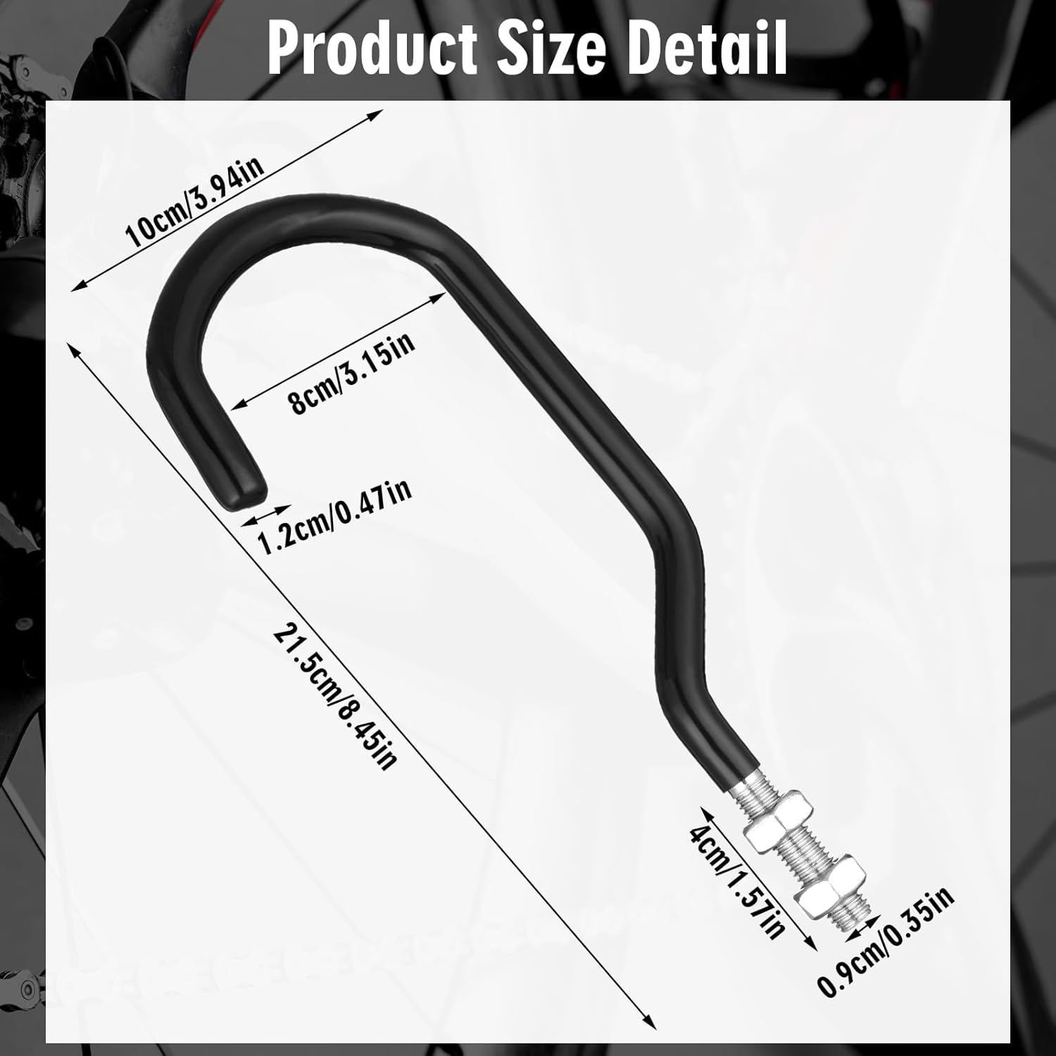 - Built to Last: crafted from robust 9 mm steel rod, these 4 pack bike hooks offer unmatched strength and durability; The inner width of the bend is about 3.17 inch; Designed to support bicycles of various sizes and weights, they're ideal for both home garages and commercial storage