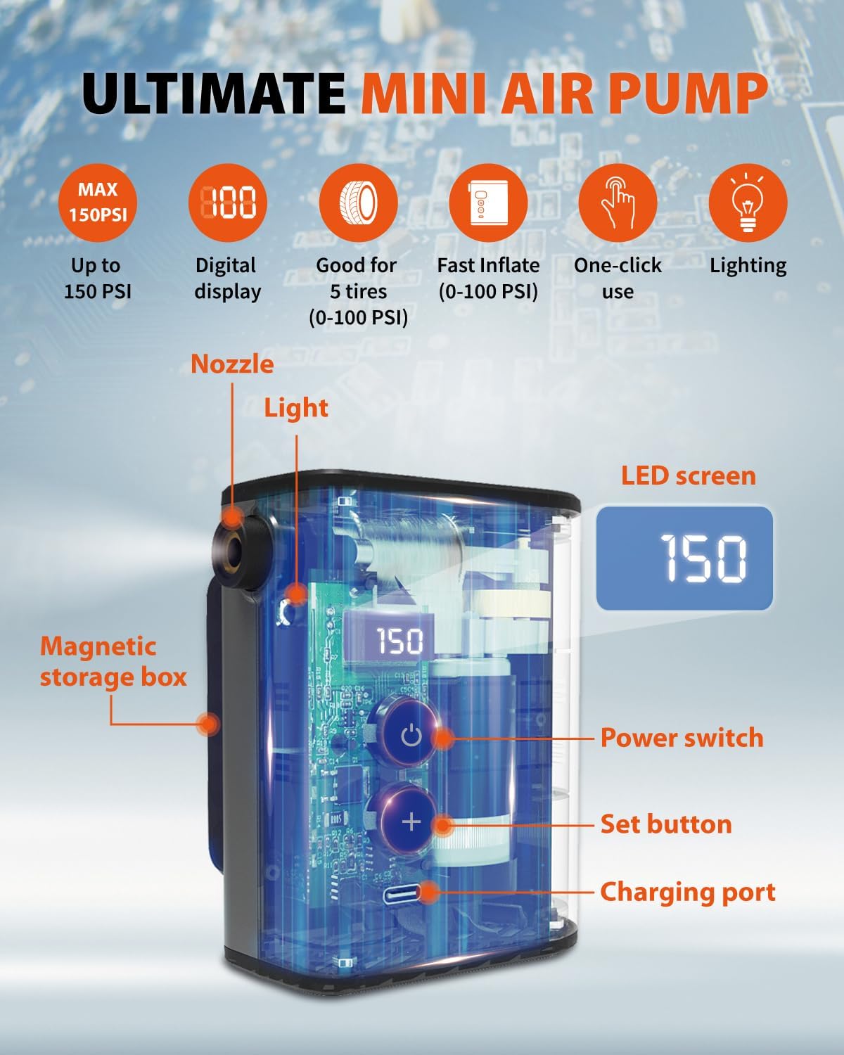 - Fast Inflation with Powerful Motor β This mini bike tire pump features a high-efficiency motor, inflating a 700 x 23C road bike tire from 80-100 PSI in just 32 seconds. With a maximum pressure of 150PSI, it is ideal for bicycles, motorcycles, and sports balls.