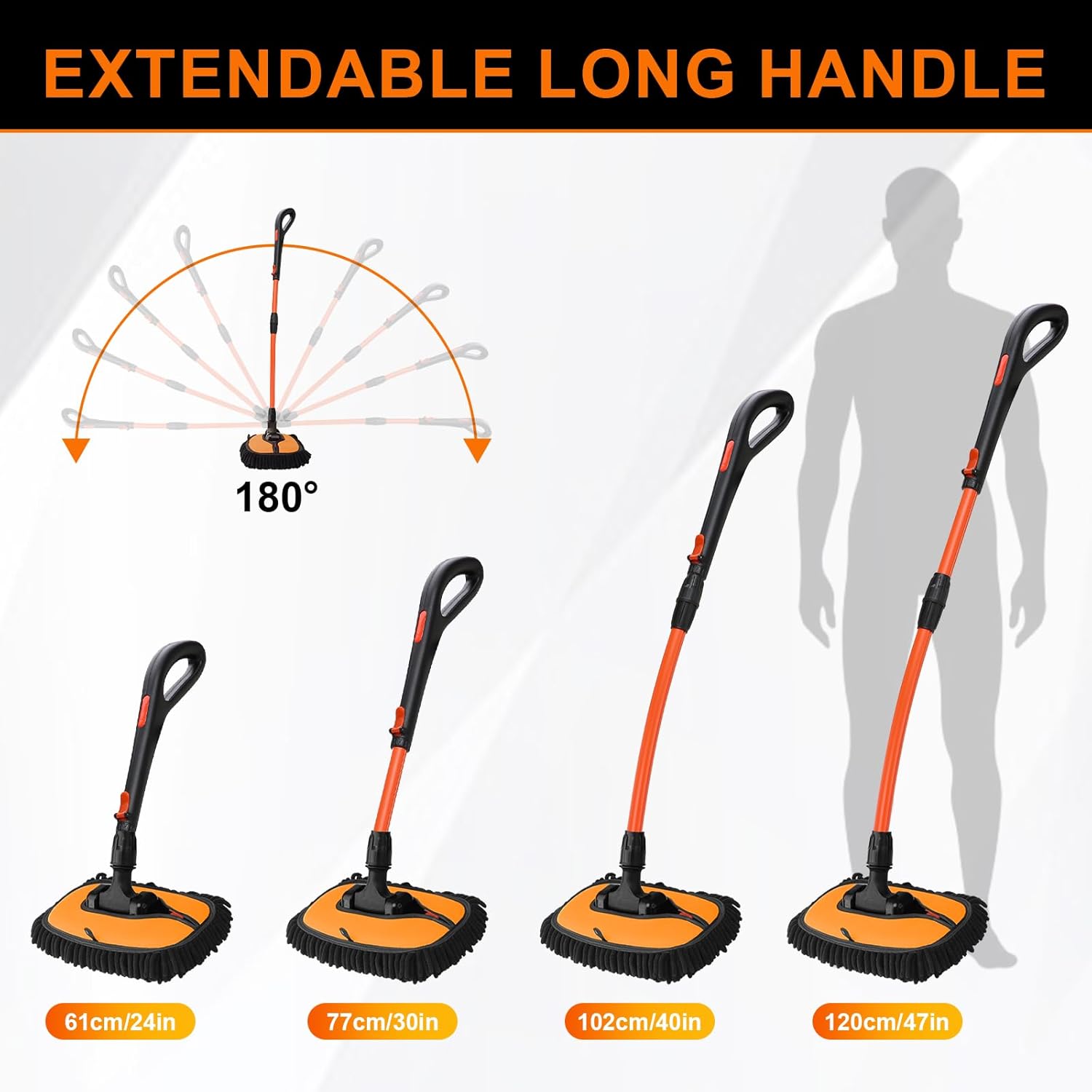 - Extendable Handle Car Wash Brush: Our car wash brush with long handle comes in 4 lengths: 24", 30", 40", and 47". Whether you’re cleaning a compact car or a tall SUV, the easy-to-install handle ensures to reach every inch of your vehicle without straining your back or shoulders.