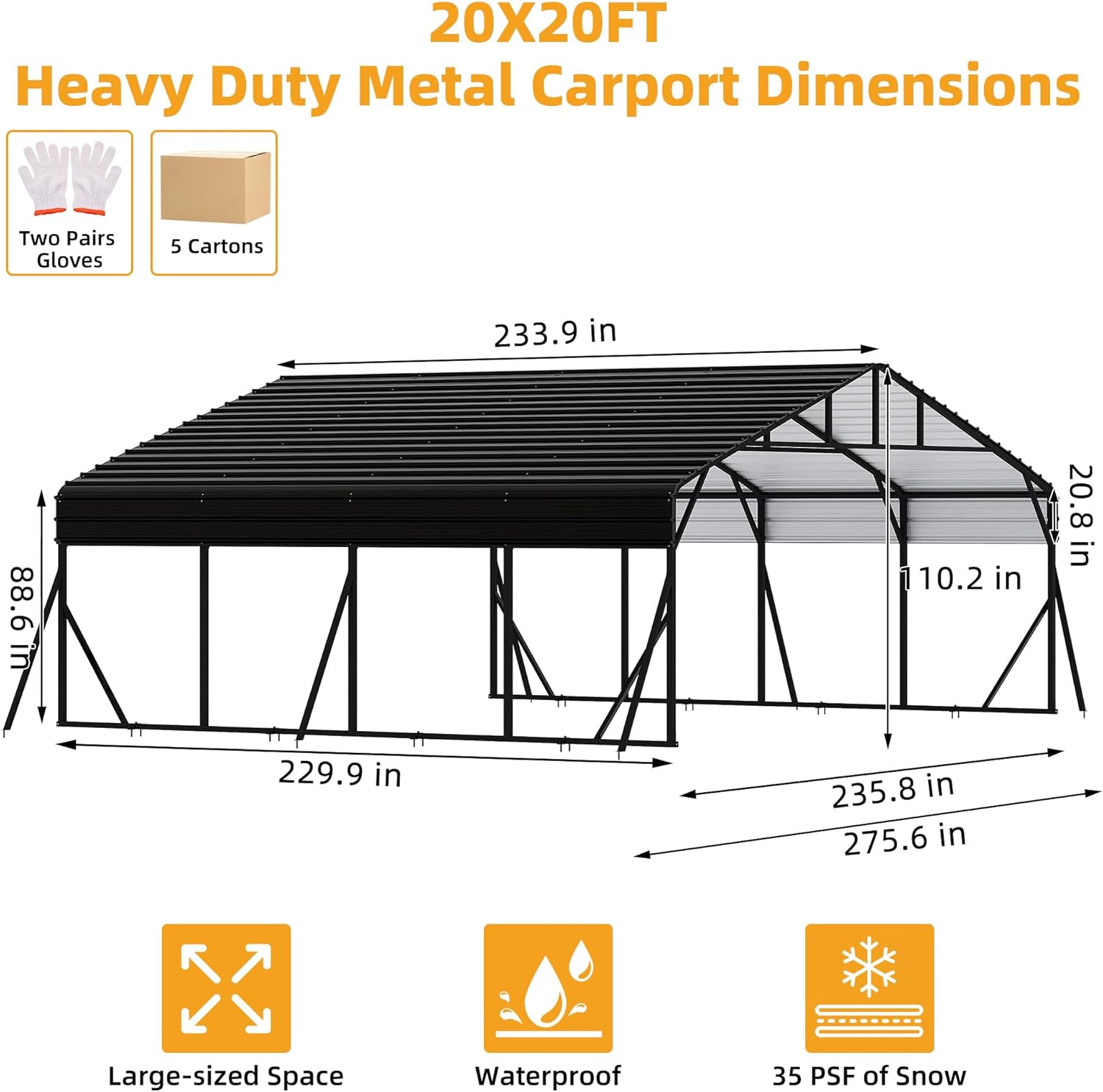 - DIMENSIONS - The outer dimensions of the outdoor metal carport heavy duty car canopy are: 20' wide, 20' deep, and 8.5' high. The inner measurements of the outdoor large metal carport canopy are: 235.8'' wide, 239.9'' deep, and 110.2'' high. The eave height is 88.6'', and the maximum entrance height is 110.2''. Note that the product will be divided into 5 packages, which might not arrive simultaneously. Following the instructions eases the garage assembly. Contact us for any product issues.