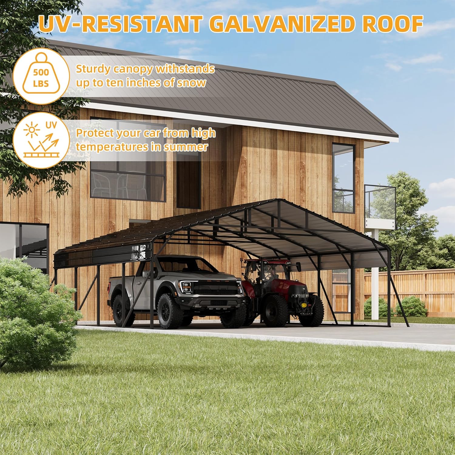 - WEATHER RESISTANCE - This tall metal carport features industrial-grade steel brackets and a highly corrosion-resistant galvanized steel roof. Ingeniously designed to withstand rain, snow, and wind. Waterproof sealing tape on the roof seams prevents water seepage in rainy days and provides exceptional protection. A soft-edged rubber strip around the roof edge reduces the risk of cuts and enhances material longevity. Wind Rating: 100 MPH; Snow Load Capacity: 35 PSF.