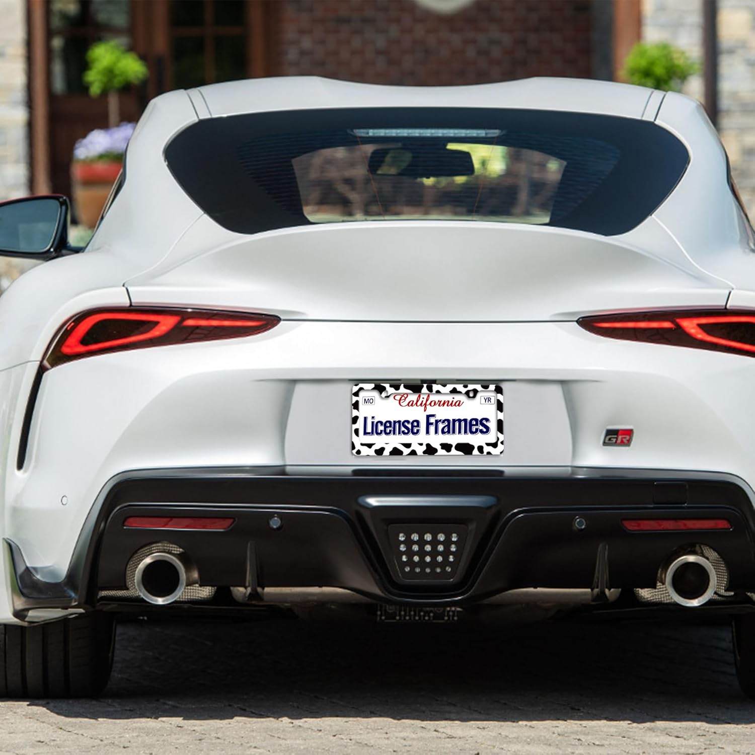 - Standard Size:This 2-hole black and white cow license plate frame measures 12.3"X 6.3"to fit all standard size U.S.license plates and protects the front and rear panels of the vehicle.The narrow border of the license plate frame does not obscure the status label or cover the state name of the license plate.