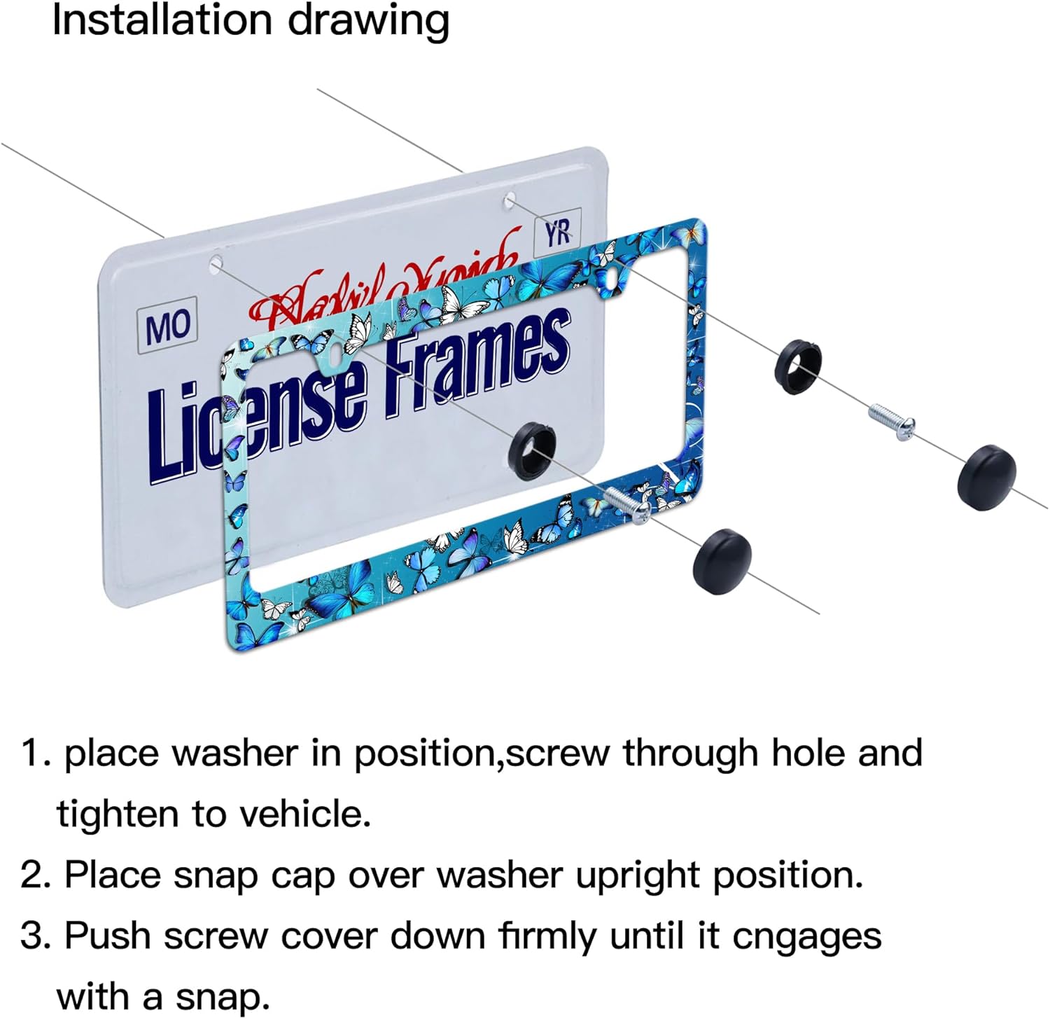 - Blue Butterfly License Plate Frame for Women:You will receive a set of 2 license plate frames,All Accessories Needed are Included (4 Screw Caps,4 Screws,4 Washers),Quick and Simple Installation,you don’t need to buy any other hardware or fasteners,Anti-theft caps are also included.