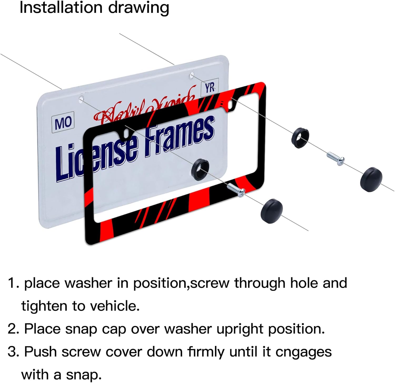- Red Metal License Plate Frame:You will receive a set of 2 license plate frames,All Accessories Needed are Included (4 Screw Caps,4 Screws,4 Washers),Quick and Simple Installation,you don’t need to buy any other hardware or fasteners,Anti-theft caps are also included.