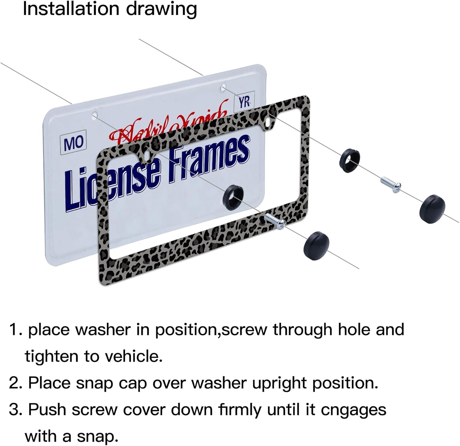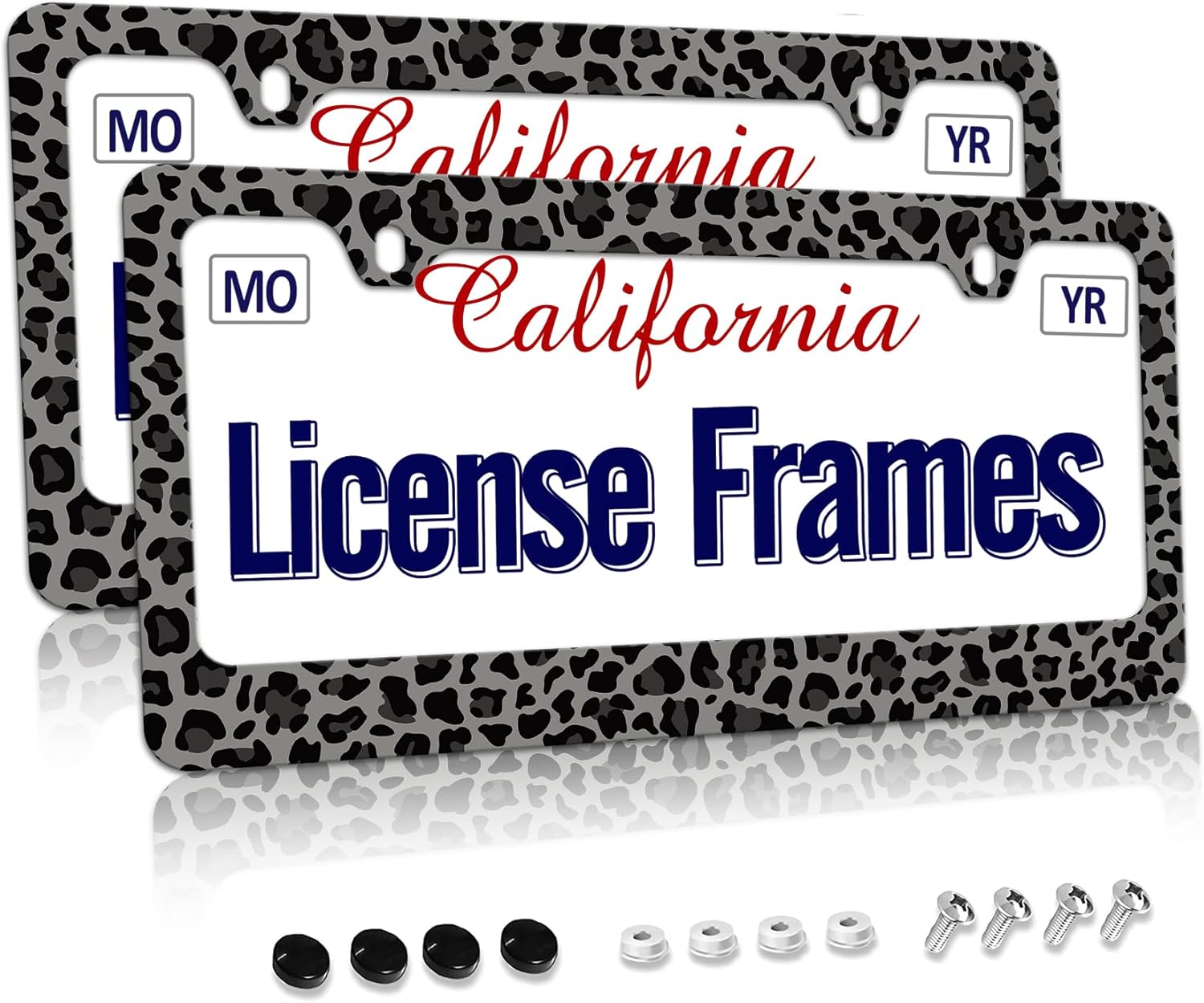 - Cheetah License Plate frames:You will receive a set of 2 license plate frames,All Accessories Needed are Included (4 Screw Caps,4 Screws,4 Washers),Quick and Simple Installation,you don’t need to buy any other hardware or fasteners,Anti-theft caps are also included.