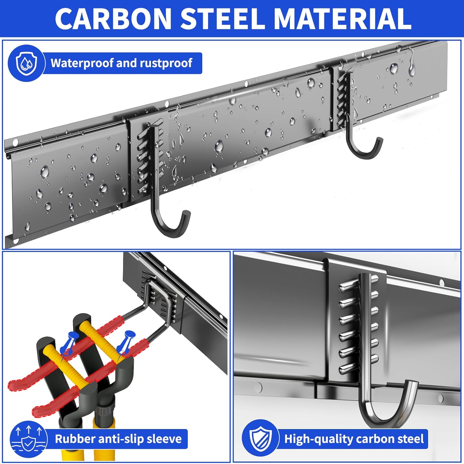 - ADJUSTABLE & VERSATILE STORAGE: tool organizers and storage features 3 tracks and 9 adjustable hooks, a versatile garage organizer for your garage. Customize height and hook placement for various items, from garden tools to folding chairs
