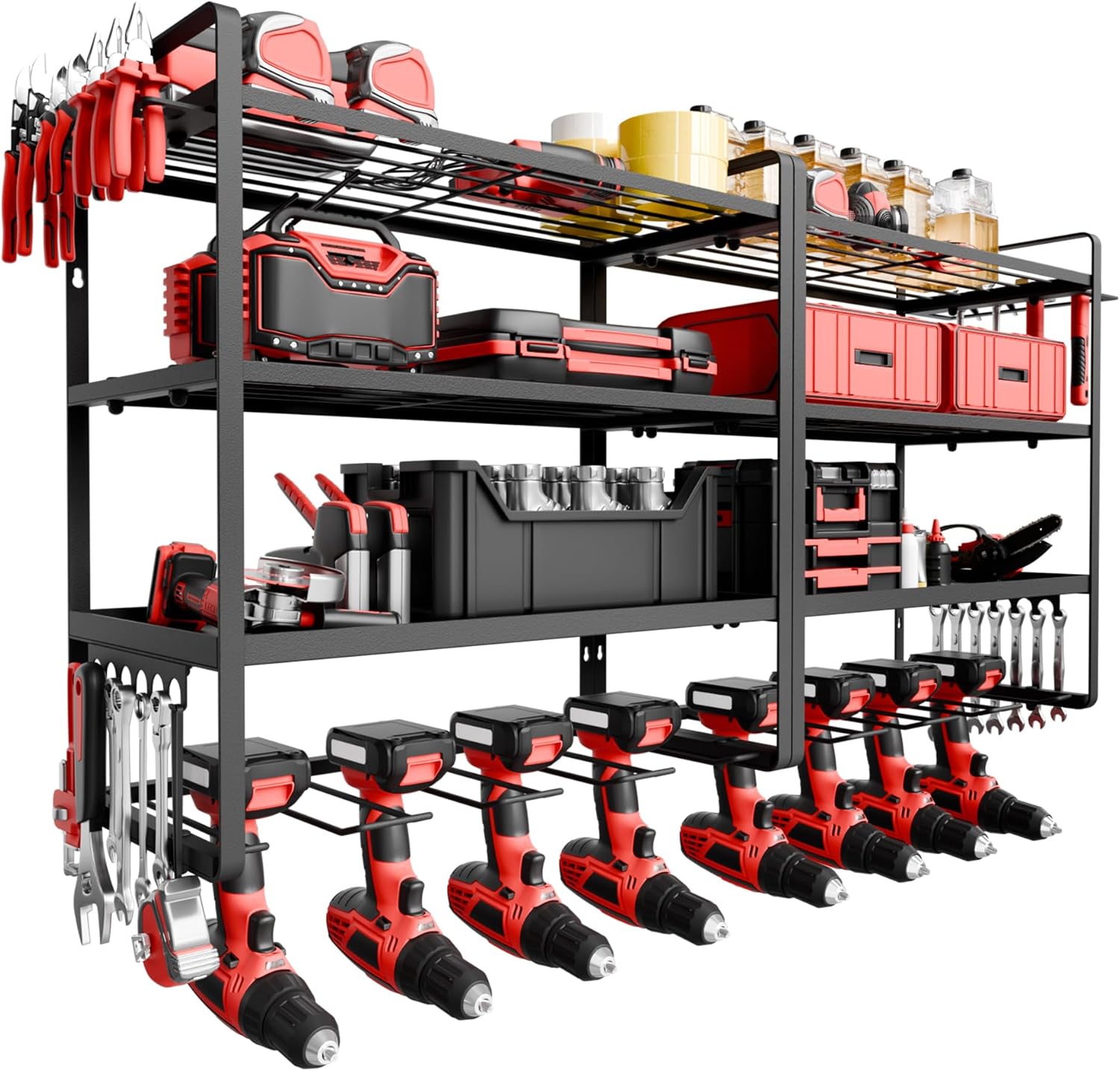 - High-Capacity Wall-Mounted Storage - Our Tool Organizer Wall Mount features a four-tier design with 16.5-inch height, offering 50% more space than standard holders. The bottom tier holds 8 cordless drills, while upper layers store heavy tools or small accessories. Side-mounted hammer, pliers, and screwdriver holders maximize versatility.