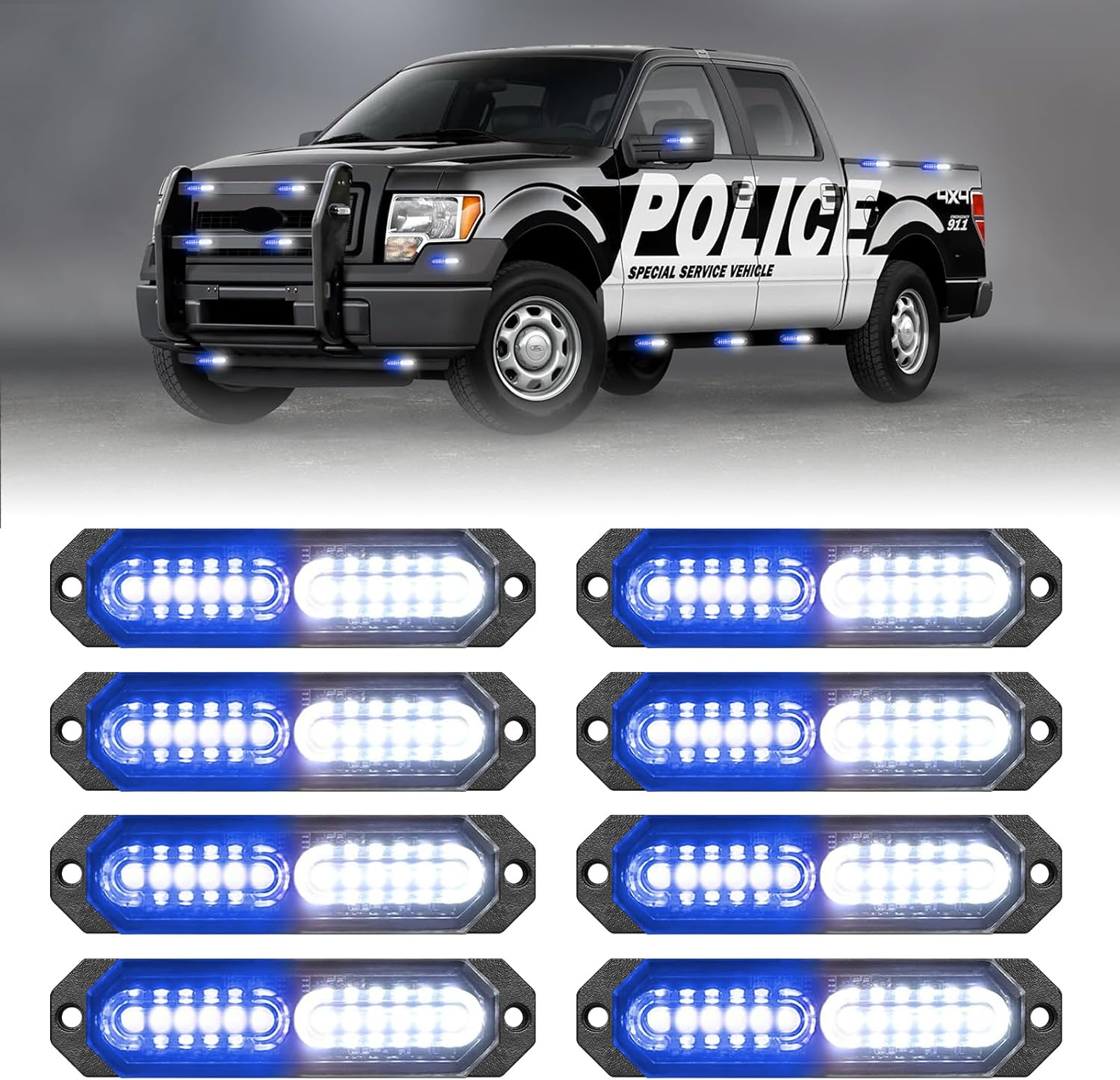 HLauto 1200T Emergency Strobe Grille Lights: 8pcs 12 LED Sync Feature Safety Warning Flashing Lights, Ultra Slim Surface Mount Hazard Caution Lights for Trucks, Vehicles, Car, ATV, UTV (Blue White)
