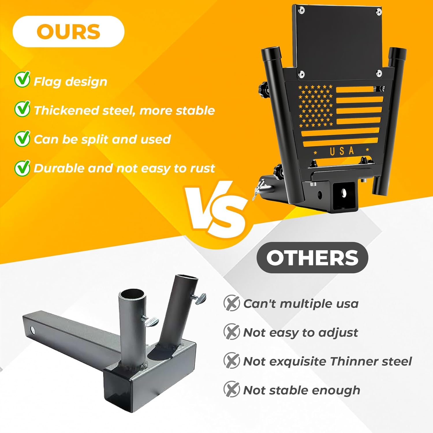 - Upgraded Design - Our trailer hitch flagpole holder comes with a 2-inch trailer hitch receiver, so you can use the towing function at the same time without removing the hitch flagpole holder. The double pole design allows you to hang double-sided flags at the same time, perfectly showing your pride, or adding brilliance to your adventure. Whether it is at a car show, sporting events, off-road riding or traveling, you can perfectly display your national flag or team flag.