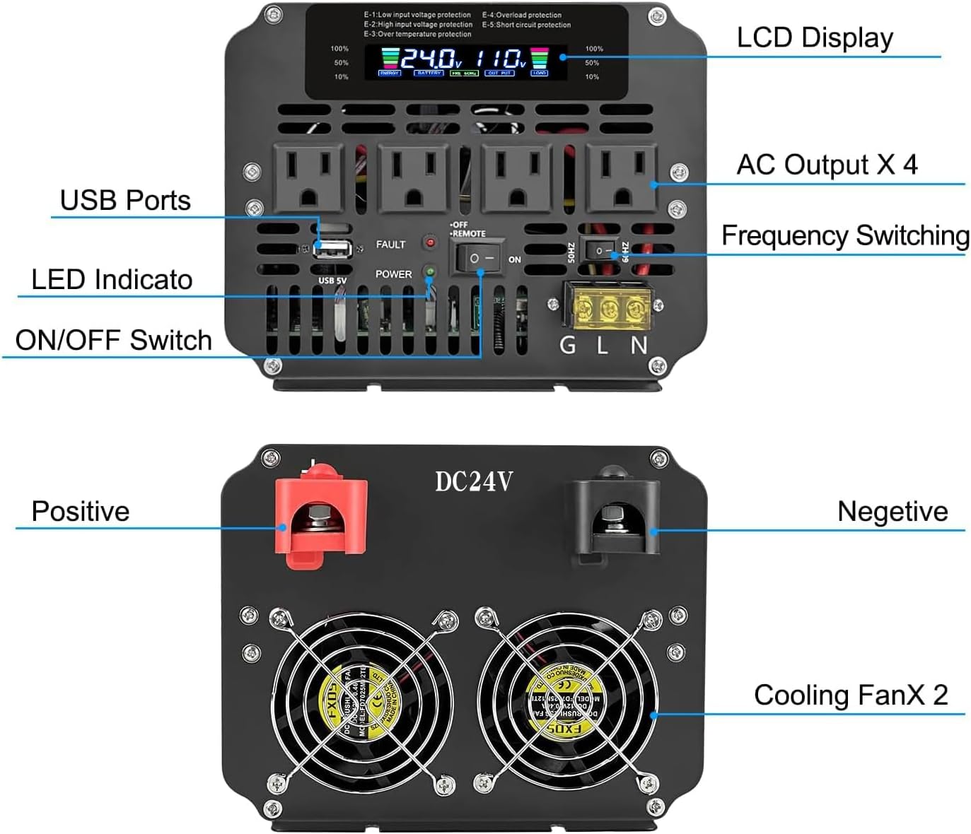 - Powerful Performance: Converts DC 24V to AC 110V/120V with a continuous output of 5000 watts, peaking at 10000W. Equipped with 4 AC output interfaces and a hard-wired connection option.