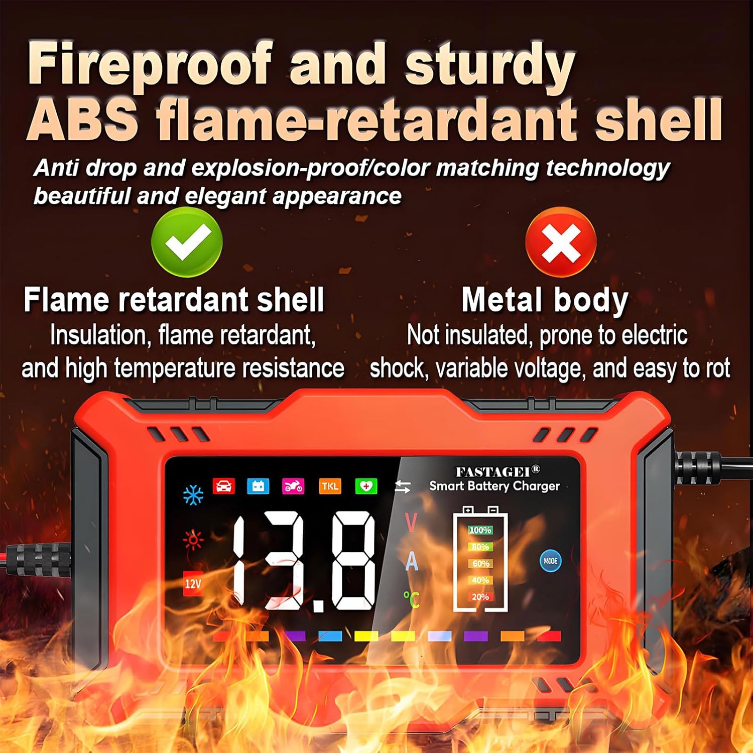 - 【OVERCHARGE PROTECTIONS】Smart control, temp compensation in hot climates and under-charging in cold climates, reverse protection, cooling system, overcurrent, fireproof material, overvoltage, short circuit. Battery trickle charger with multiple protection ensure the safety charging at anytime anywhere