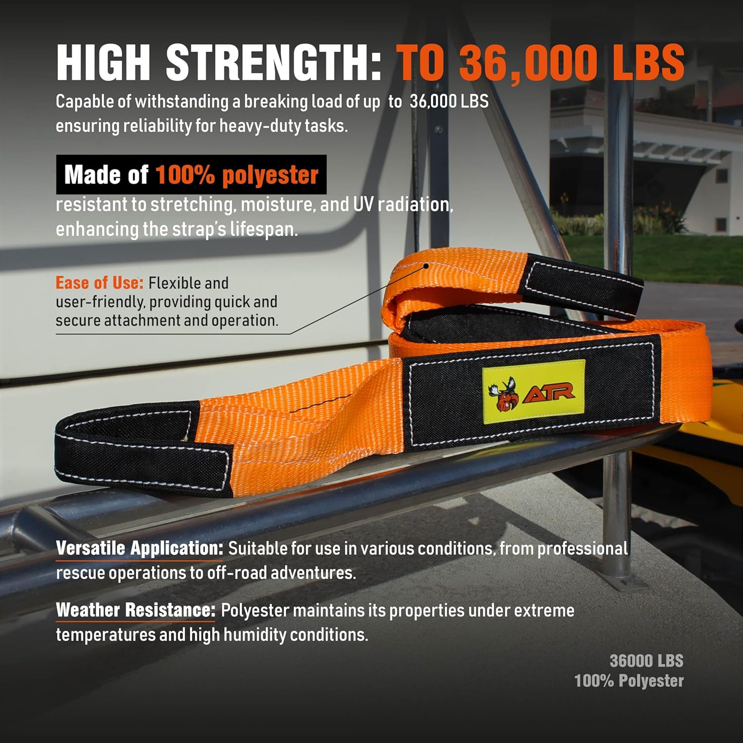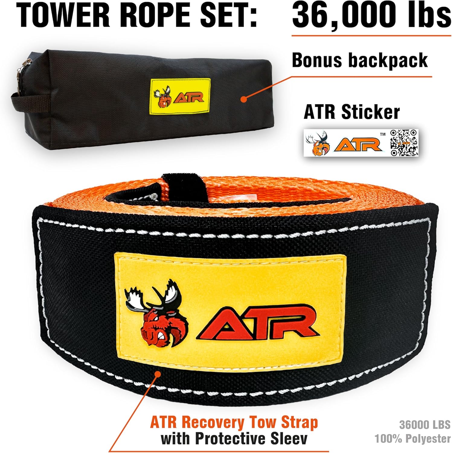 ATR Recovery Tow Strap 3.5" x 20ft – 36,000 lbs Break Strength, Heavy Duty Snatch Strap for Truck, SUV, UTV, Off-Road Pulling, Tow Rope with Storage Bag