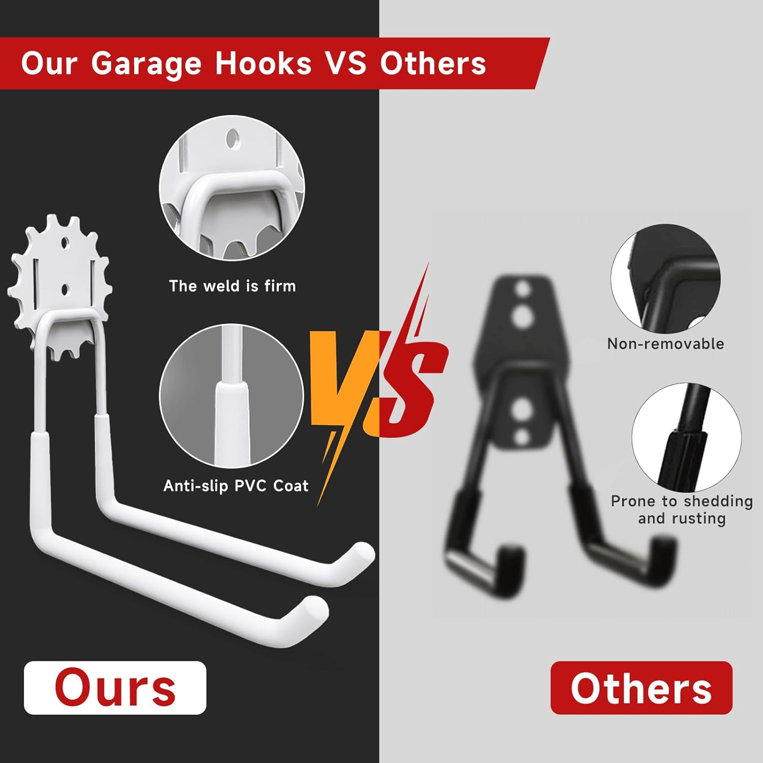 - Package Included: This set includes 4 double hooks in 2 different sizes: 2 large J hooks, 2 large U hooks, versatile J/U-hooks maximize space with reliable grip.You can create an efficient storage space—perfect for your garage storage system