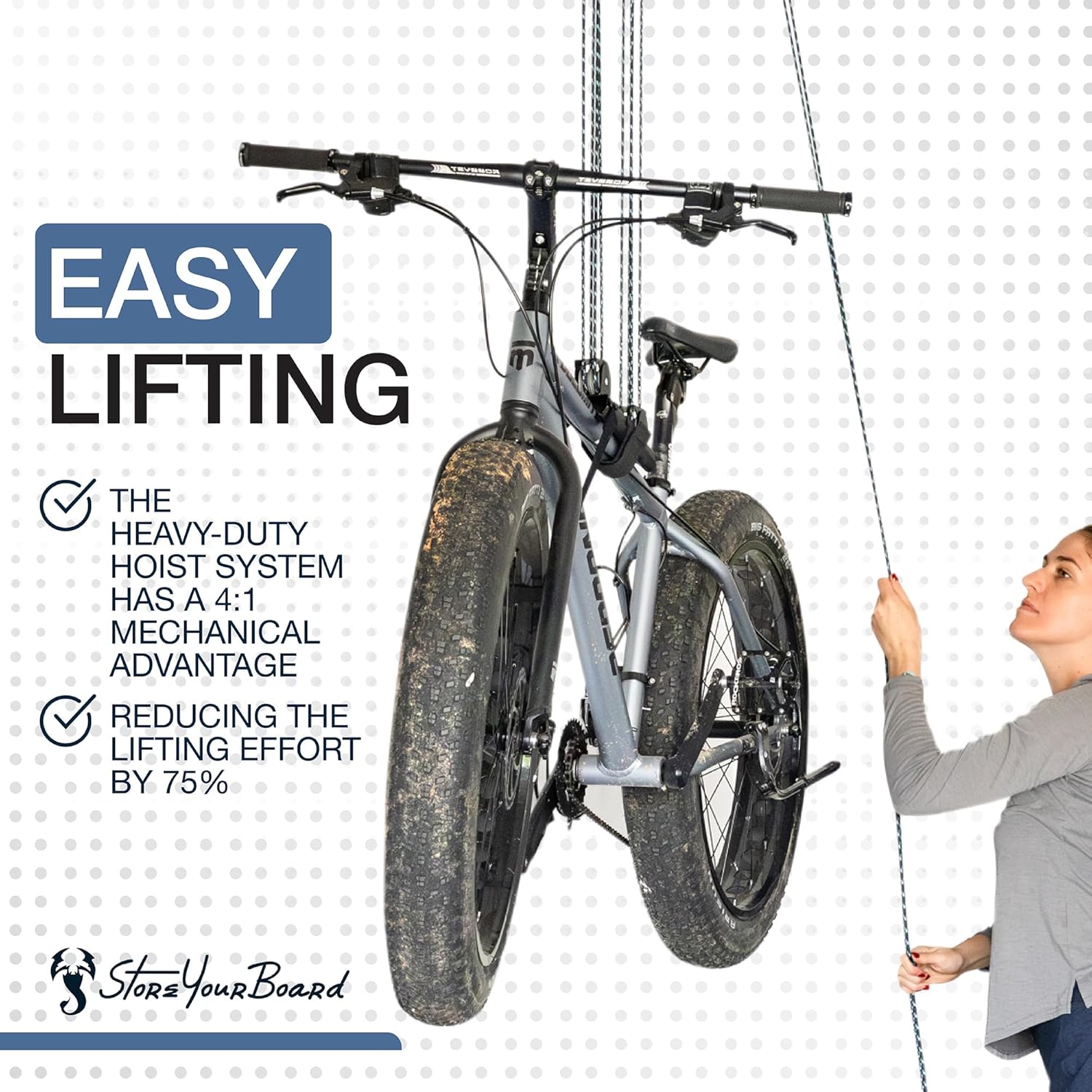 StoreYourBoard Bike Hoist, No-Slip Bicycle Ceiling Storage, Heavy-Duty Garage Pulley Lift System, Road, MTB, Fat Tire, Ebike Hanger