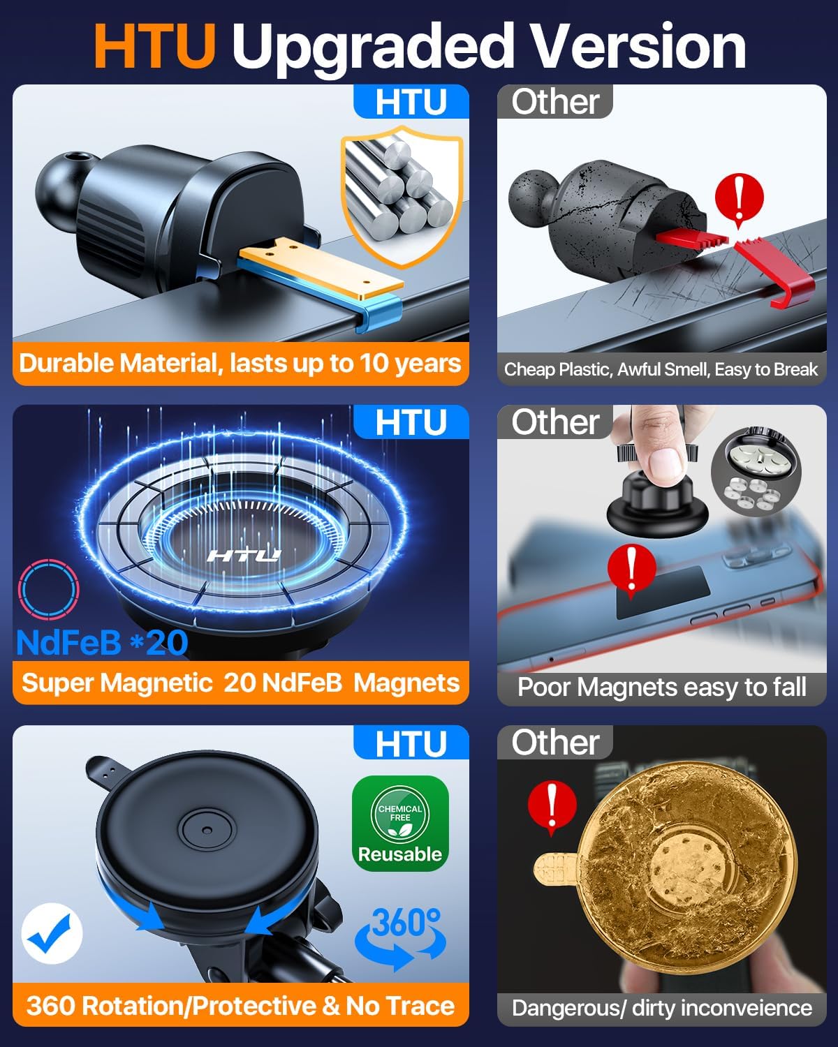 - [Exclusive 360Β° Rotatable Suction Cup, Flexible Adjustment] Different from fixed suction cup, HTU magnetic car phone holder can be rotated 360Β°at any angle without removing the suction bottom