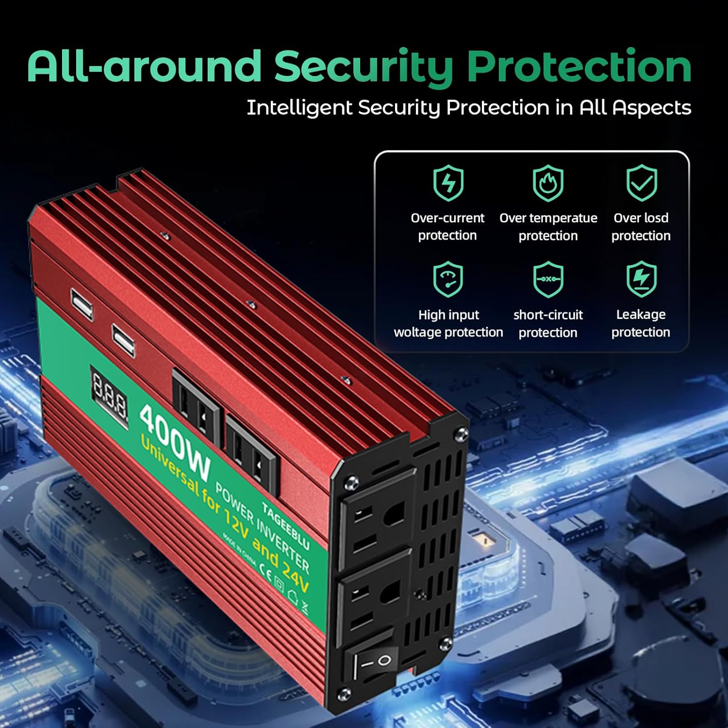 - 【Powerful output】The TAGEEBLU Power Inverter offers a continuous DC to AC power supply of 400W, converts 12V/24V DC battery power to standard 110V AC, with a peak surge of 800W during load startup. Conversion efficiency > 92%. It employs advanced high-frequency transformers and features 100% pure copper ultra-flexible cables, ensuring a high level of safety during use