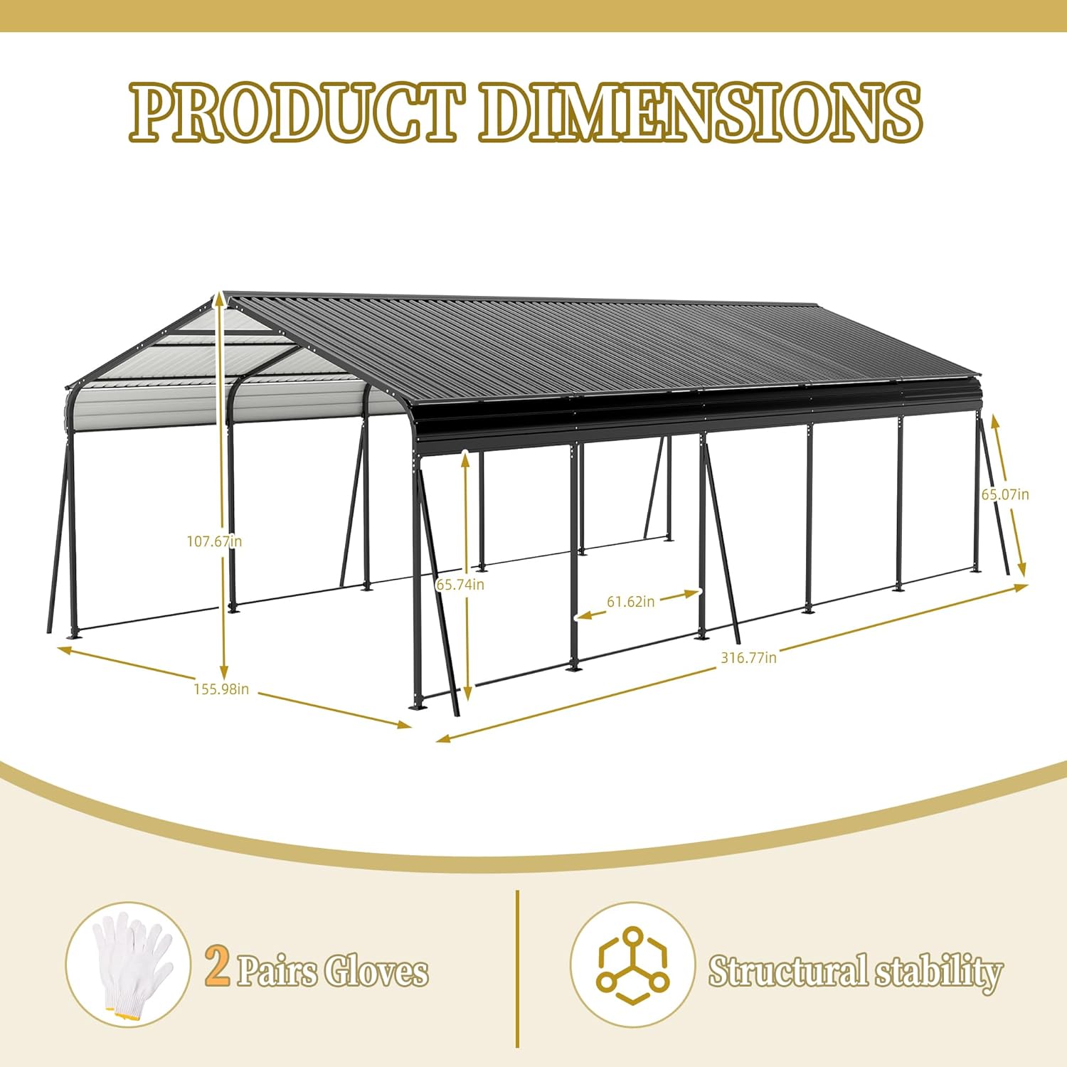 13x26.5 FT Metal Carport, Heavy Duty Car Port Canopy with Galvanized Steel Roof & Frame, Oversized Metal Carport Kit with Hooks, Steel Car Shelter, Outdoor 2 Car Garage for Car, Boat, Truck, Dark Gray