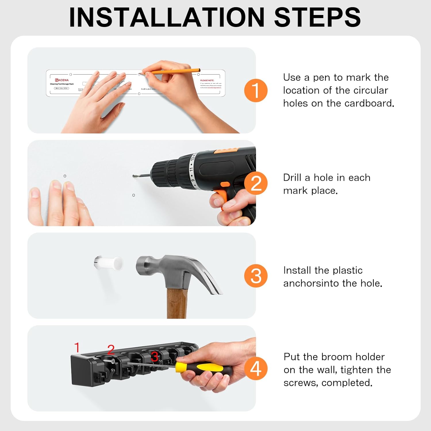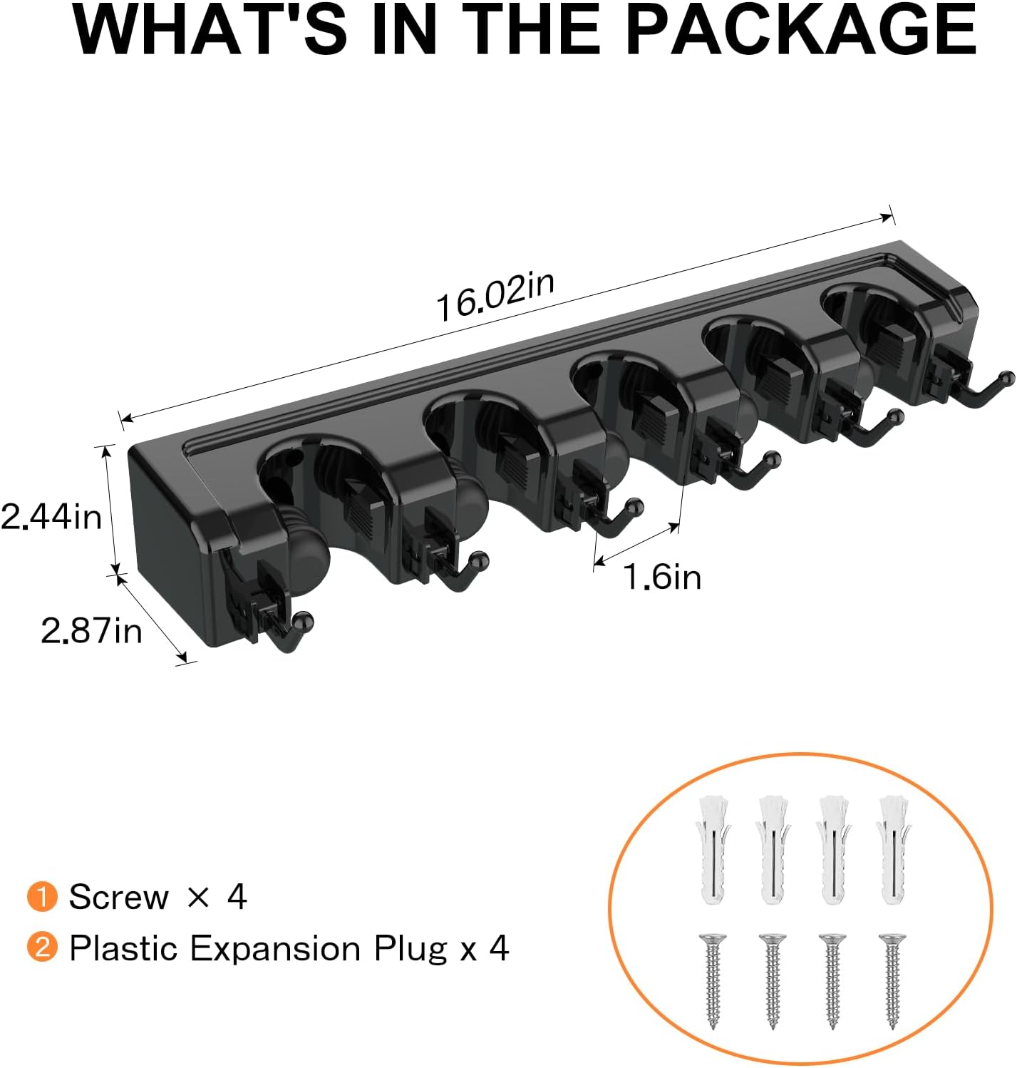 - CLEANING TOOLS STORAGE RACK: This wall mounted broom rack is suitable for storing cleaning supplies, gardening tools, kitchen utensils and hardware tools. Our broom rack is the best companion for your kitchen, garage, laundry room, keeping your work area clean and tidy