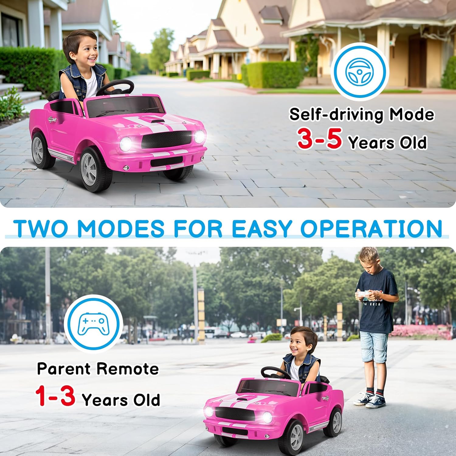 - 2 Control Methods - Kids electric car supports pedal operation and remote control operation. Pedal operation supports 2 speed switching, and remote control operation supports 3 speed switching, which improves the safety of children