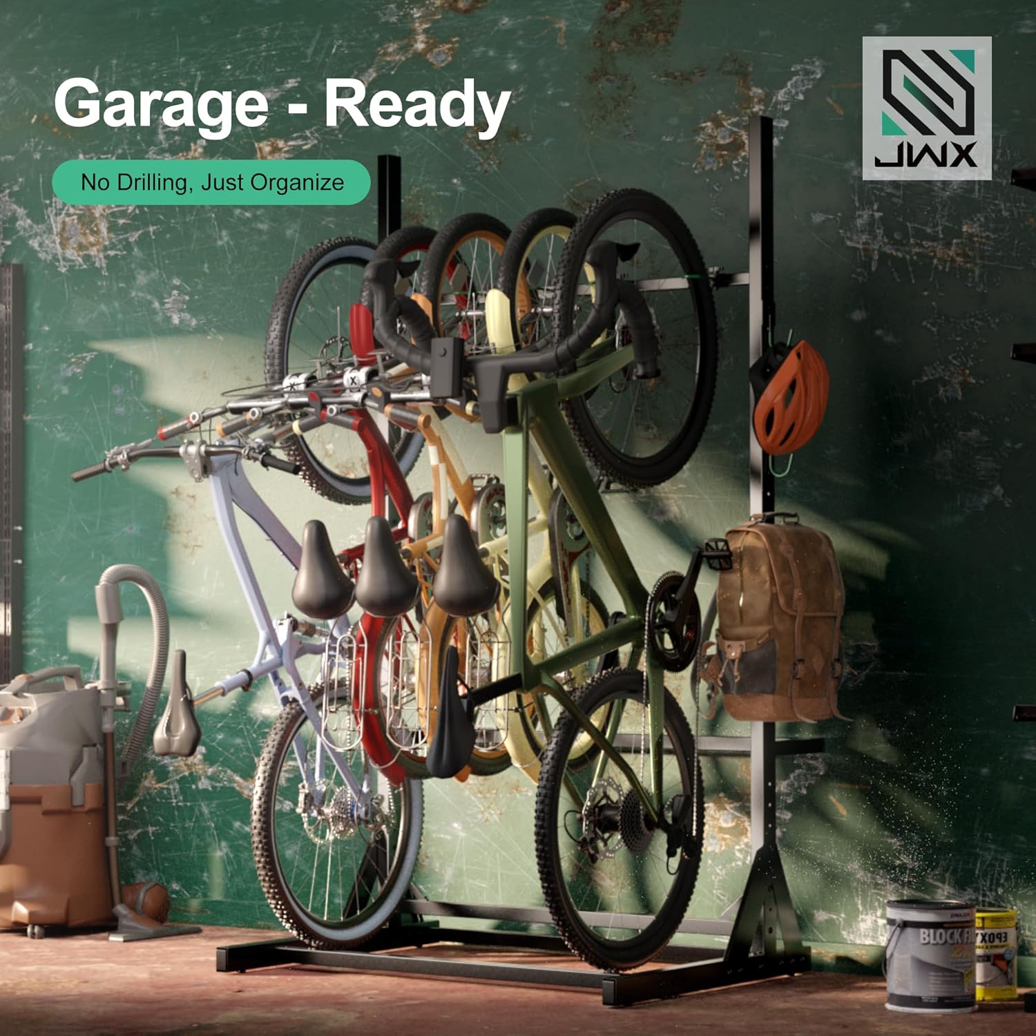 - Special Feature : Finally, we include a visual quick-start installation guide that reduces assembly time by up to 50%, a direct response to market feedback on poor instructions and over-complicated builds from competitor models., In addition, the entire steel frame is treated with an advanced coating, offering superior resistance to corrosion compared to traditional powder coatings â a feature especially valuable in high-humidity garages or outdoor-adjacent storage environments., The hook coating isn't just functional â it's branded. All JWX hooks are finished in our signature Morandi green rubberized material, delivering both visual identity and frame-safe performance. This signature coating also extends to the two integrated accessory hooks located on each side panel, designed specifically for hanging helmets, hydration packs, and cycling tools, all while protecting your gear from abrasion or damage., To further enhance flexibility, JWX developed a precision-adjustable hook spacing system. Each bike hook is mounted on a sliding rail with lockable tension screws, allowing users to customize the distance between bikes to prevent handlebar interference â especially useful for accommodating wide or asymmetrical handlebars found on e-bikes, fat tire bikes, and kids' bikes., Unlike typical freestanding bike racks, the JWX Freestanding 5 Bike Rack features a proprietary dual-triangle support structure on both sides â an engineering breakthrough inspired by architectural principles to deliver superior load-bearing capacity and enhanced lateral stability. This structural innovation means the more bikes you add, the more stable the rack becomes â an inversion of traditional design weaknesses. Finally, we include a visual quick-start installation guide that reduces assembly time by up to 50%, a direct response to market feedback on poor instr⌠See more
