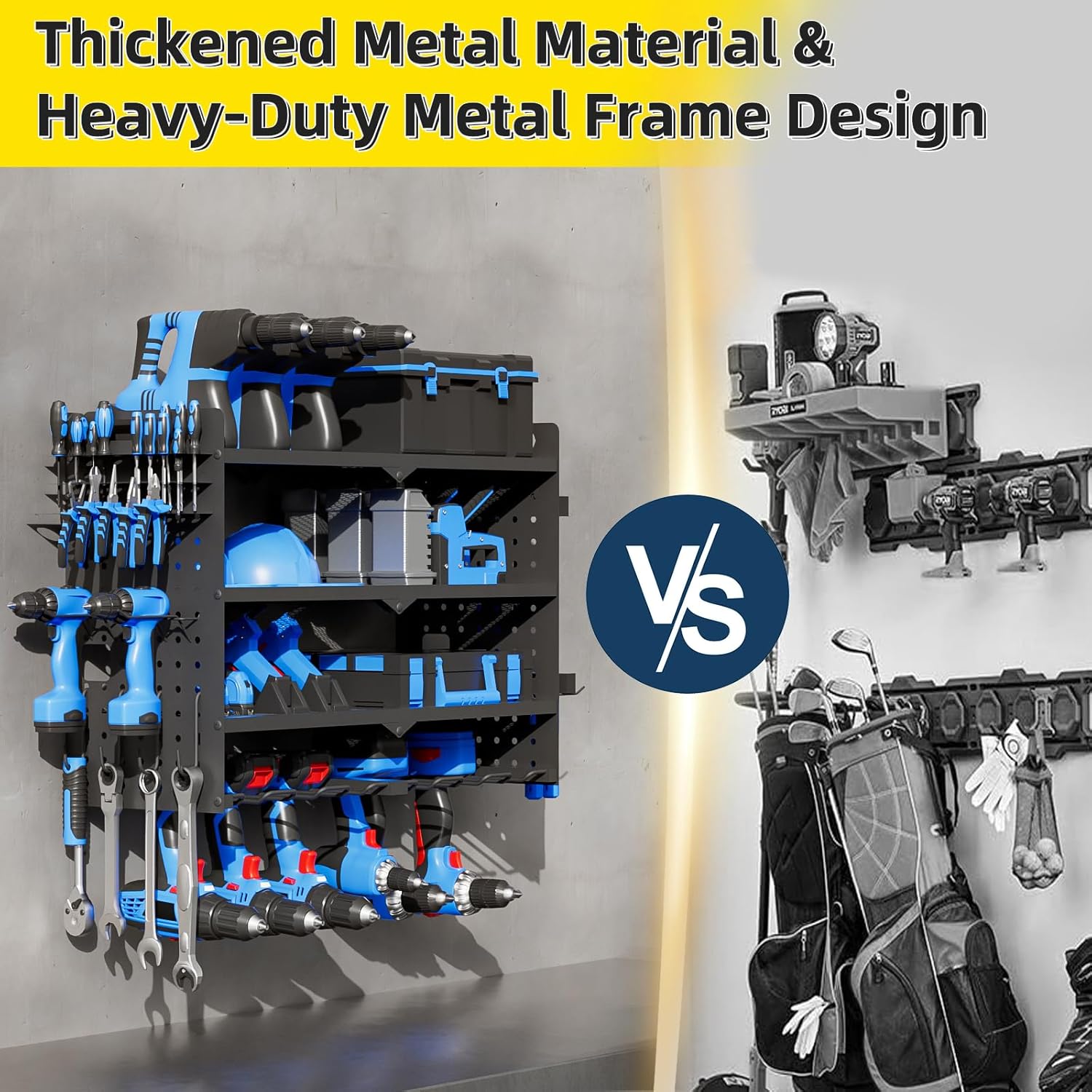- 💪420-600 LB Load Capacity & Heavy-Duty Construction : Engineered from industrial-grade steel, our large power tool organizer wall mount boasts an exceptional 420-600 lb load capacity. Confidently store heavy power tool storage of any weight. Rigorous testing ensures stability – no more worries about breakage or falls.