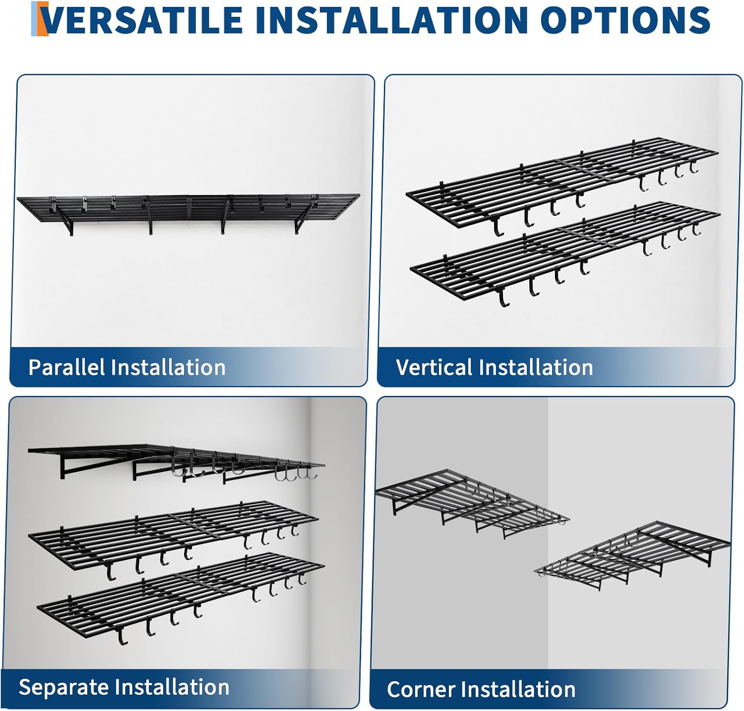 - HOOK DESIGN: Each set of wall-mounted shelves comes with 4 large hooks and 4 small hooks, perfect for hanging bikes, extension cords, ropes and other items under the garage storage system, adding extra functionality to your shelf setup. It is designed to keep your screwdrivers, power tools, batteries and chargers neatly organized, creating a clean and efficient environment, improving your work efficiency and comfort.