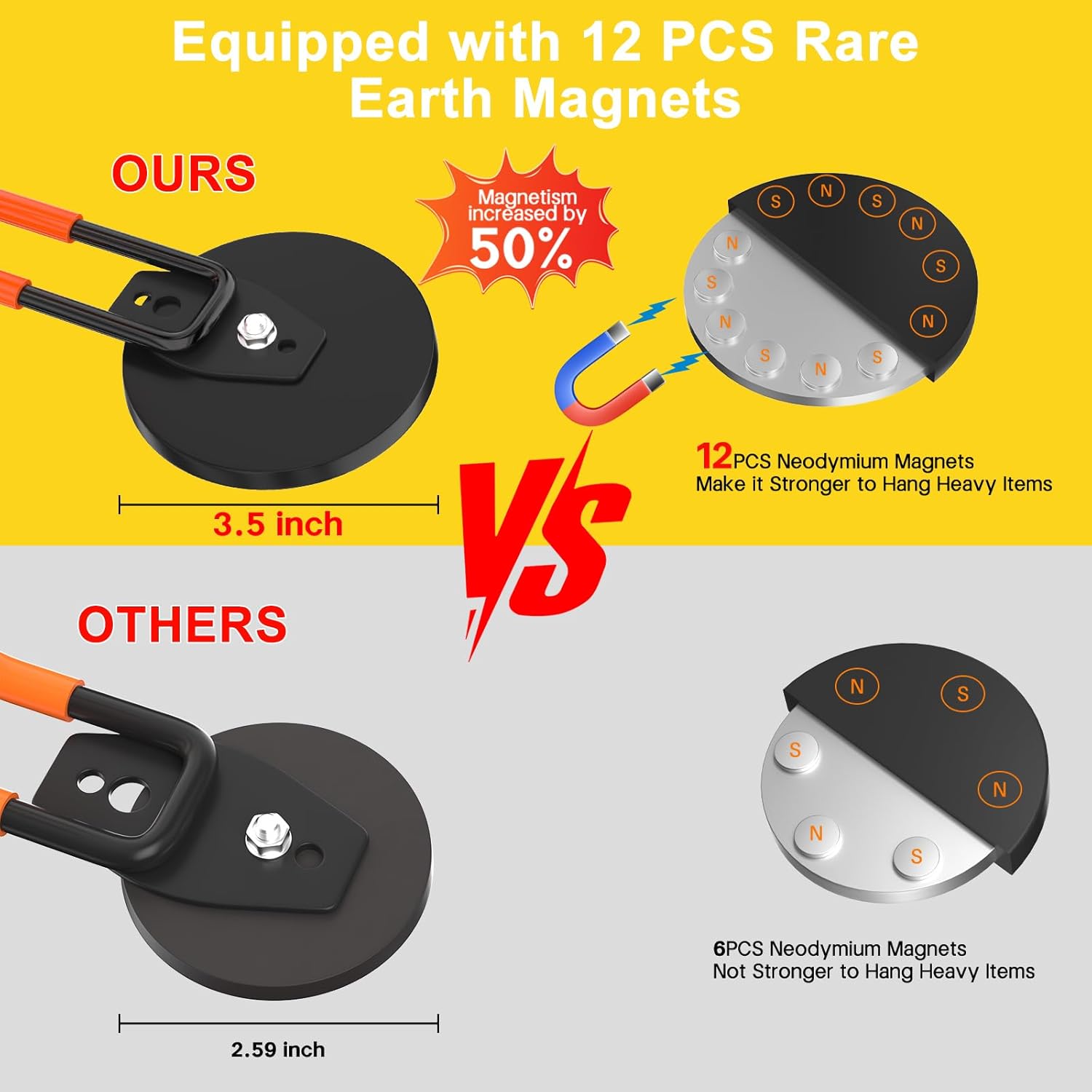 - Rare earth magnet hooks: In addition to increasing the magnet diameter from 2.59" to 3.46", ENUODA has increased the number of powerful neodymium magnets from 6 to 12, making our heavy magnetic hook stronger than those made with less magnets and able to hang heavier items.