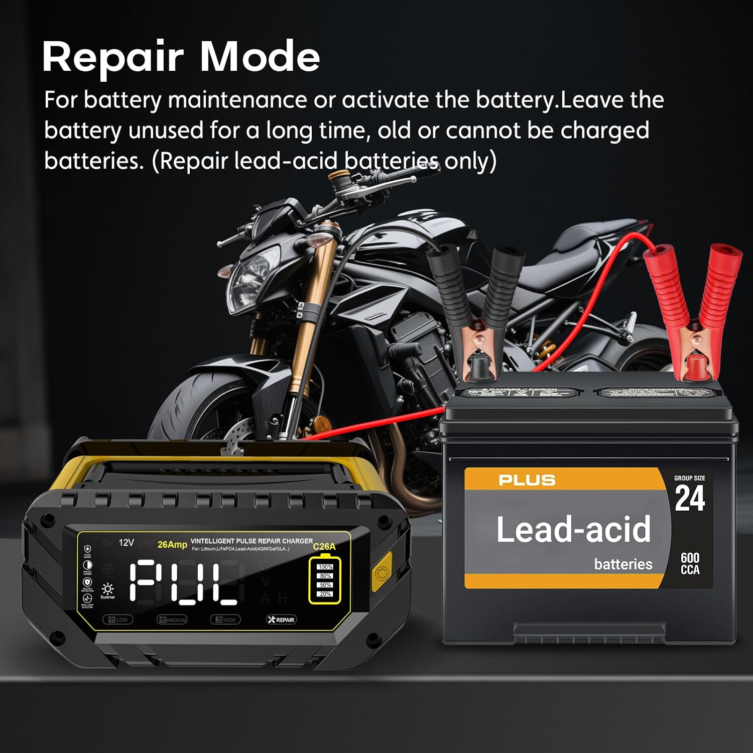 - SCIENTIFIC BATTERY REPAIR - The battery charger automatically detects battery sulfation and acid stratification, using the latest pulse repair function to restore lost battery performance and extend battery life. Note: It will not start the battery or repair a completely lost battery, the battery voltage is not lower than 2V.