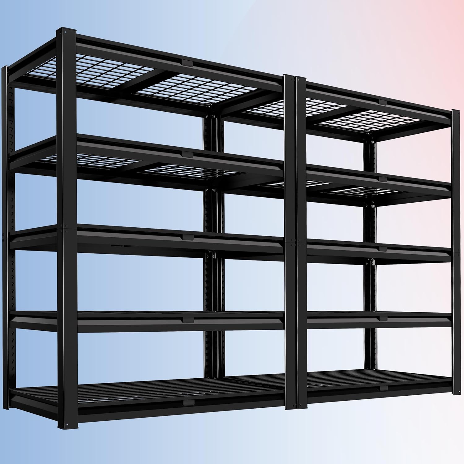 - ă36" W X 16" D X 72" H Garage Shelving offers Monster Storage Spaceă--PrimeZone garage shelving are composed of double-layer thickened heavy duty metal support posts and bolded metal wire net shelves. Each shelf add an additional middle support beam, which can greatly improve the stability and load-bearing capacity of the storage shelf unit. The heavy duty shelving has a load capacity of 550 lbs per tier, and a total load capacity of 2750 lbs for 5 tiers storage rack.