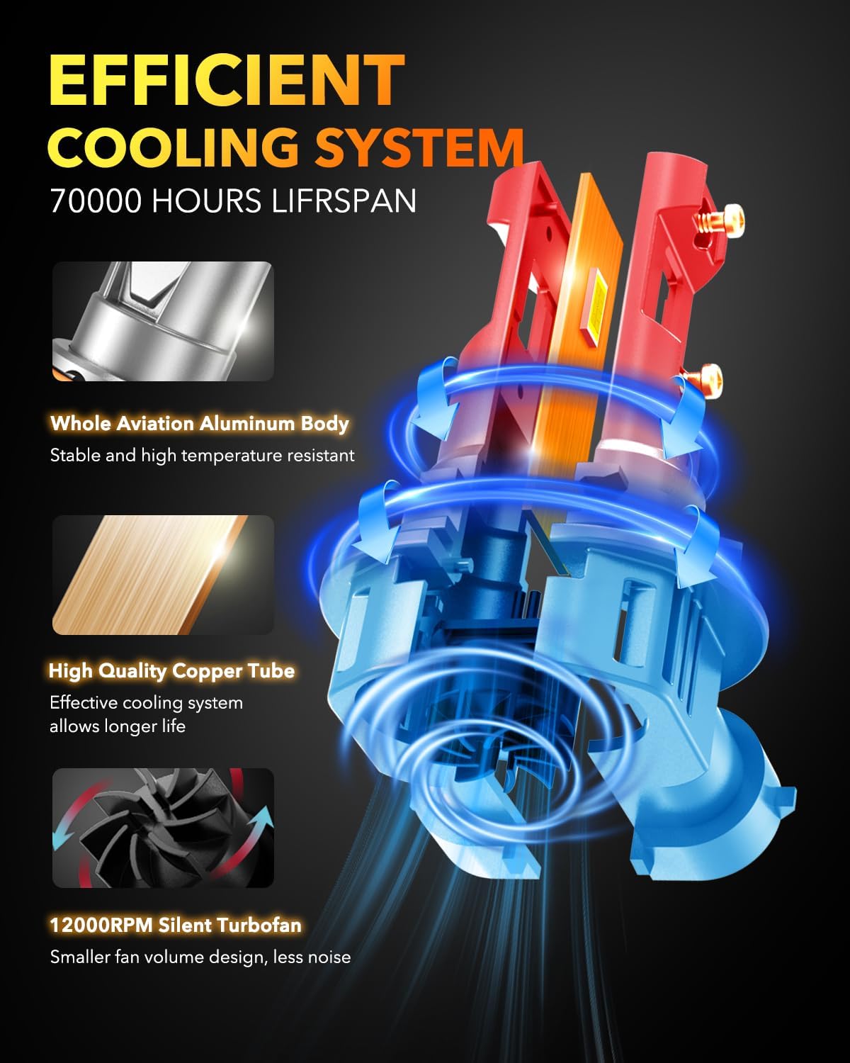 - ăOver 70,000 Hours Lifespană: Crafted with premium materials including aerospace-grade aluminum alloy and reinforced copper substrate, and featuring a high-RPM cooling fan, this bulb achieves exceptional thermal management. The advanced cooling system enables stable, prolonged illumination, freeing you from the hassle of frequent bulb replacements.