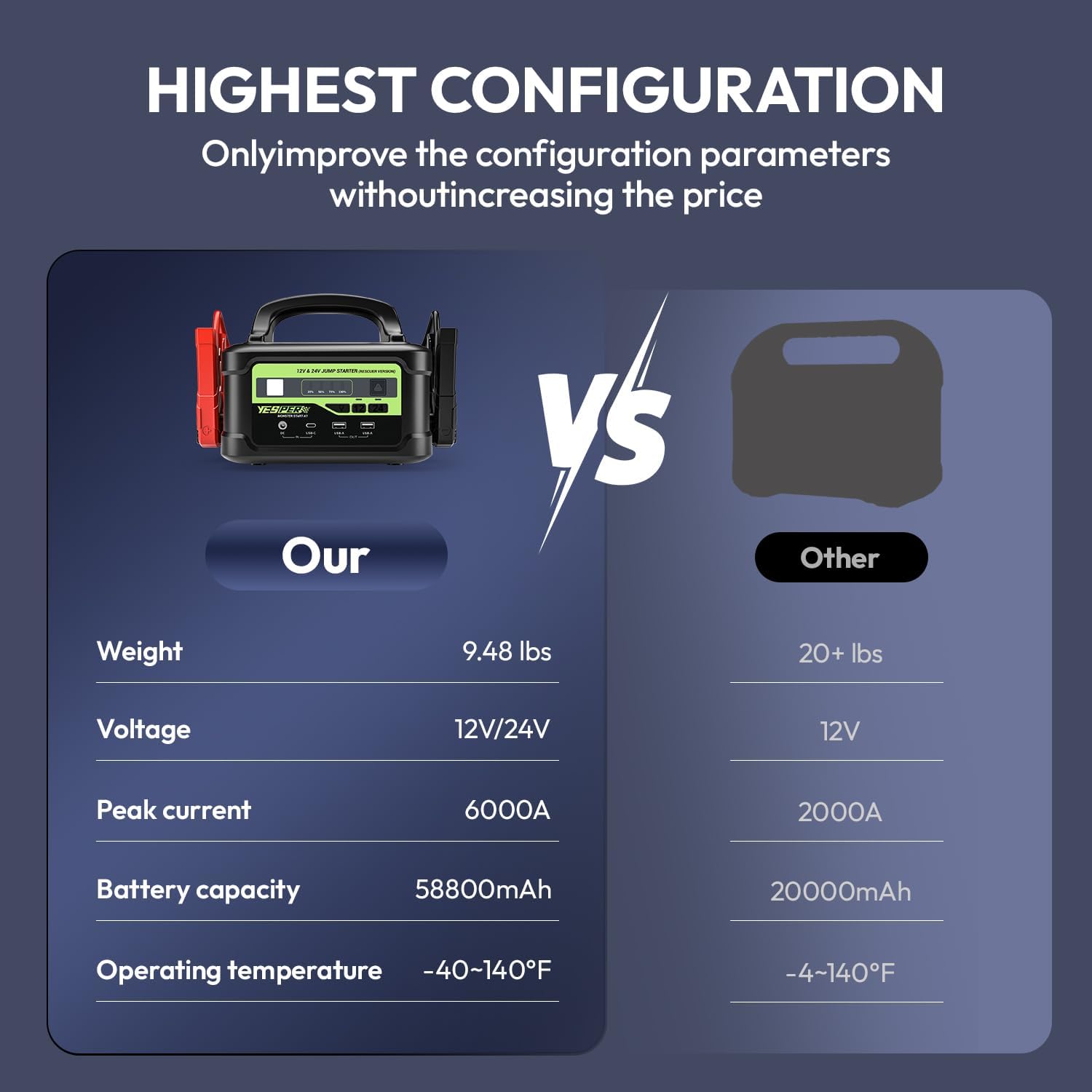 - 【DSLI IV Smart Technology】- By reassembling the structure and adopting microcomputer control technology, YESPER battery jumper starter portable increases the voltage by 30%, providing a more stable starting current of up to 6000A, which can quickly start your car in 1 second. In addition, the powerful intelligent temperature control technology can significantly reduce the starting temperature, helping you start the vehicle faster, safer, and more stably