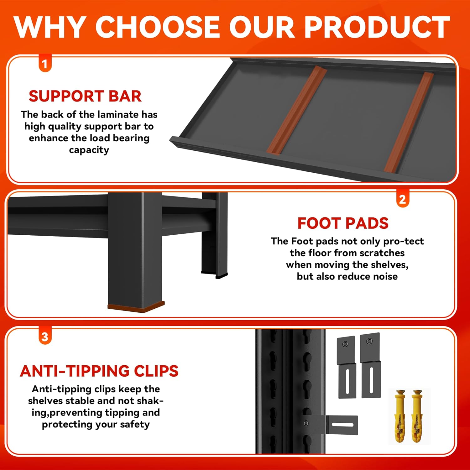 - ăExtremely Sturdy & Durable Garage ShelvingăConstructed from high-strength premium cold-rolled steel with advanced powder-coated technology, this metal shelving unit resists rust, oxidation, and wear. The industrial-grade coating not only enhances aesthetics but also boosts durability, making it a heavy-duty shelving solution for long-term use
