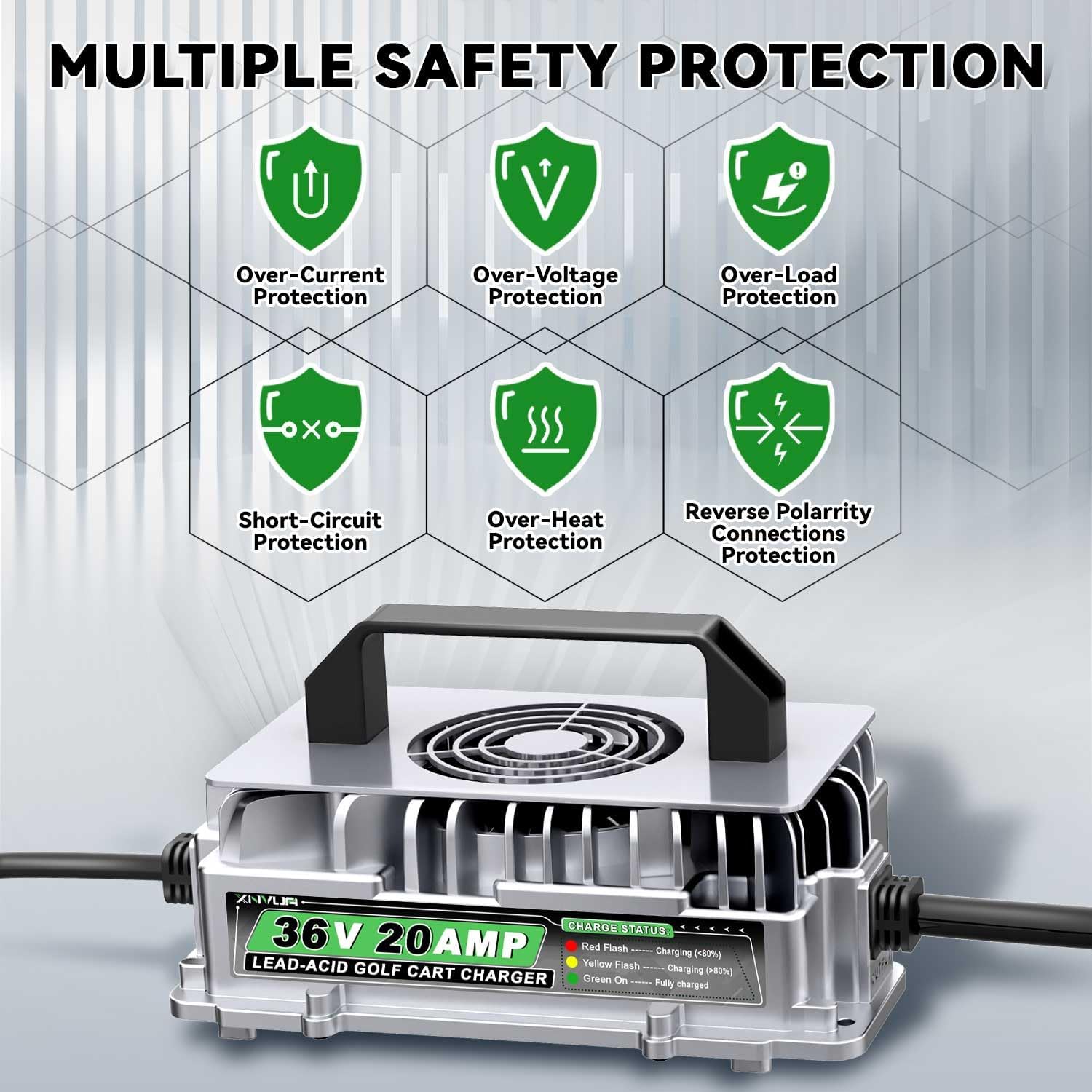 - 【Vortex Heat Dissipation Design】The 36 volt ezgo golf cart battery charger comes with a cooling fan and is designed with a vortex around it, which greatly increases the cooling efficiency and enables it to work stably.