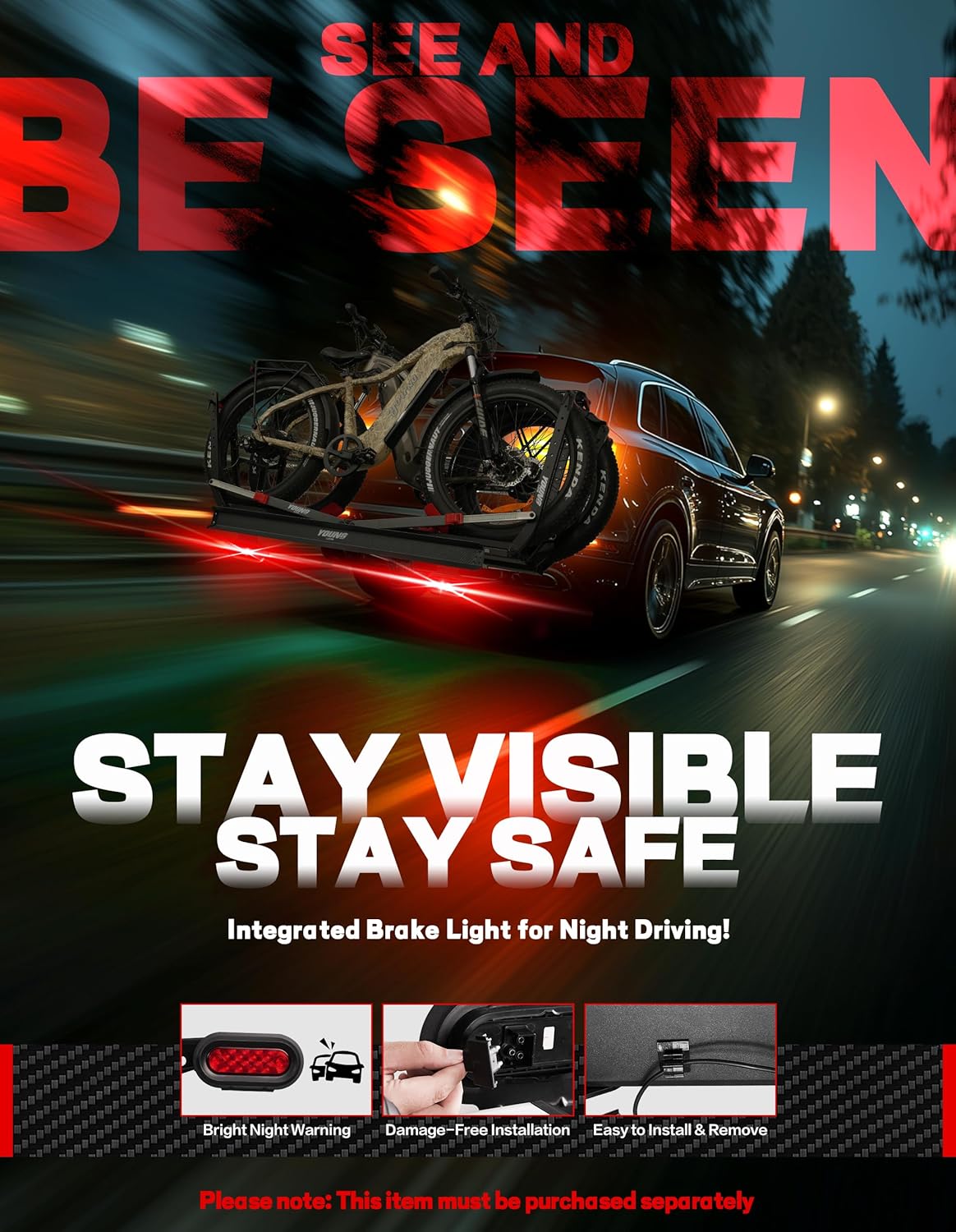 - ăUser-Friendly Featuresă Includes integrated loading ramp for easy bike mounting (supports heavy e-bikes) and 90° foldable design that clears your trunk space. Optional brake light compatibility (sold separately) enhances night visibility. Quick-install hitch system gets you road-ready in minutes.