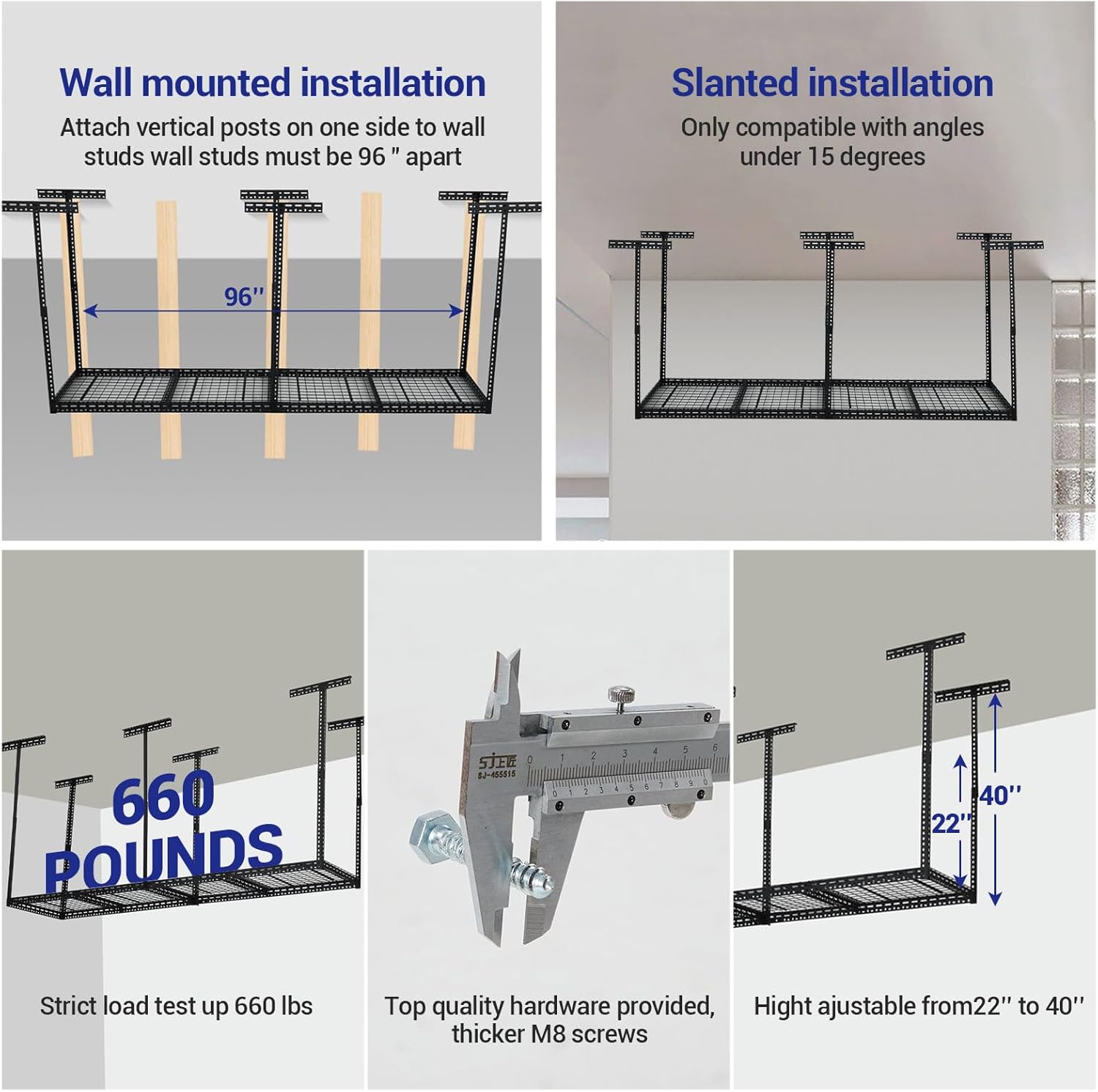 - β Versatile Height Adjustment (22"-40"): Customize your overhead storage rack to fit any ceiling height or storage need. Easily adjust from 22 to 40 inches to maximize vertical space, accommodating tall items in your garage or clearing obstacles in low attic areas. Perfect for seasonal gear or bulky supplies.
