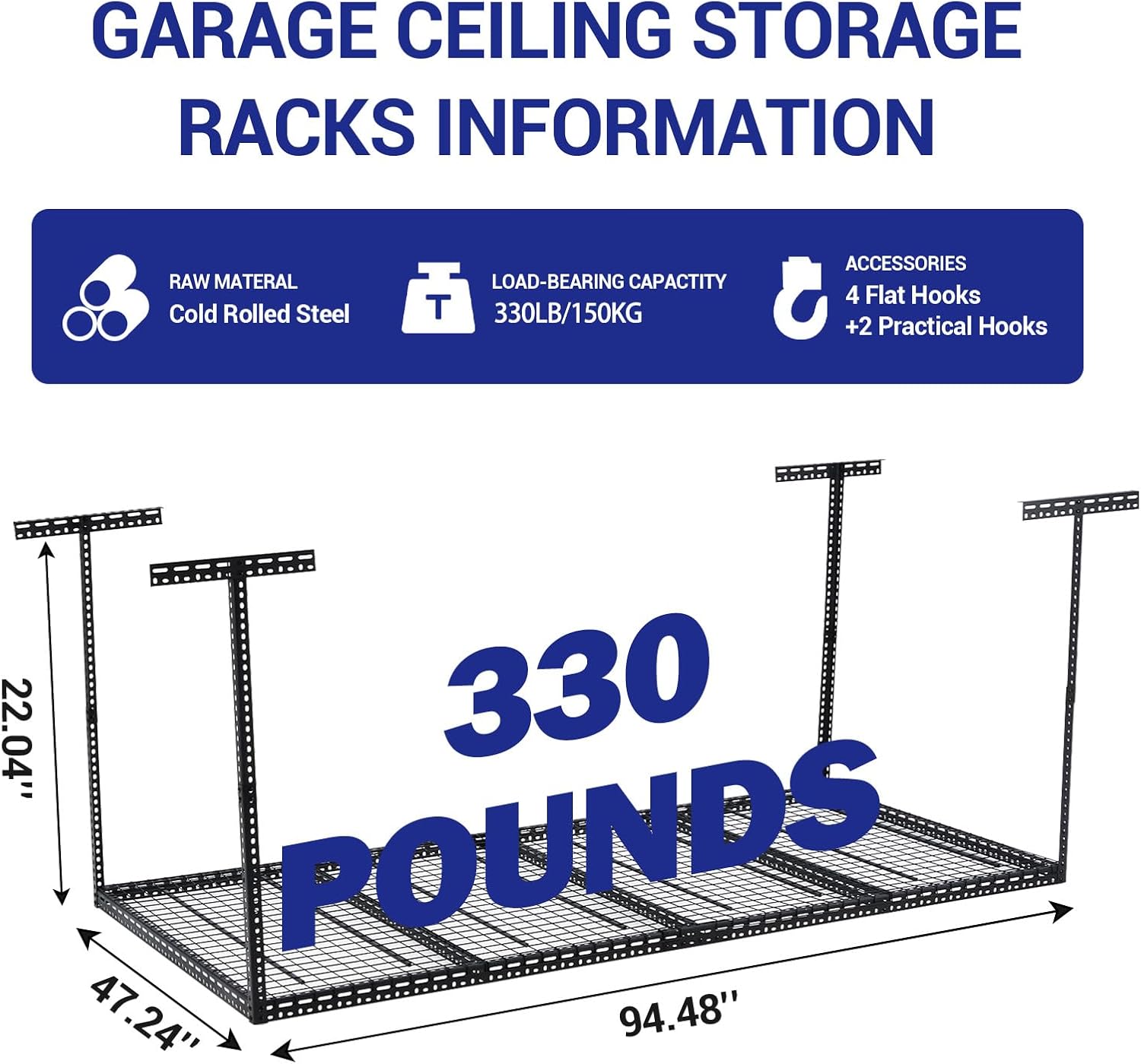 - β Massive 105 Cu Ft Storage & Space Maximizer: Expertly utilizes wasted ceiling space (96"x48"x40") creating 105 cubic feet of organized storage. Frees up valuable garage, basement, or shed floor space by moving clutter overhead. The open grid design allows easy visibility and access to stored items.