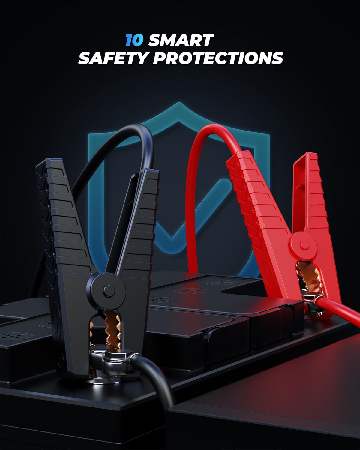 - LED light in 4 modes:The jump box for car battery is equipped with a built-in LED flashlight, which is useful in low-light conditions or emergencies. It offers 4 adjustable light modes:normal, strobe, SOS andcolored. Additionally, the jump starter provides excellent protection for use in environments ranging from -4°F to 140°F