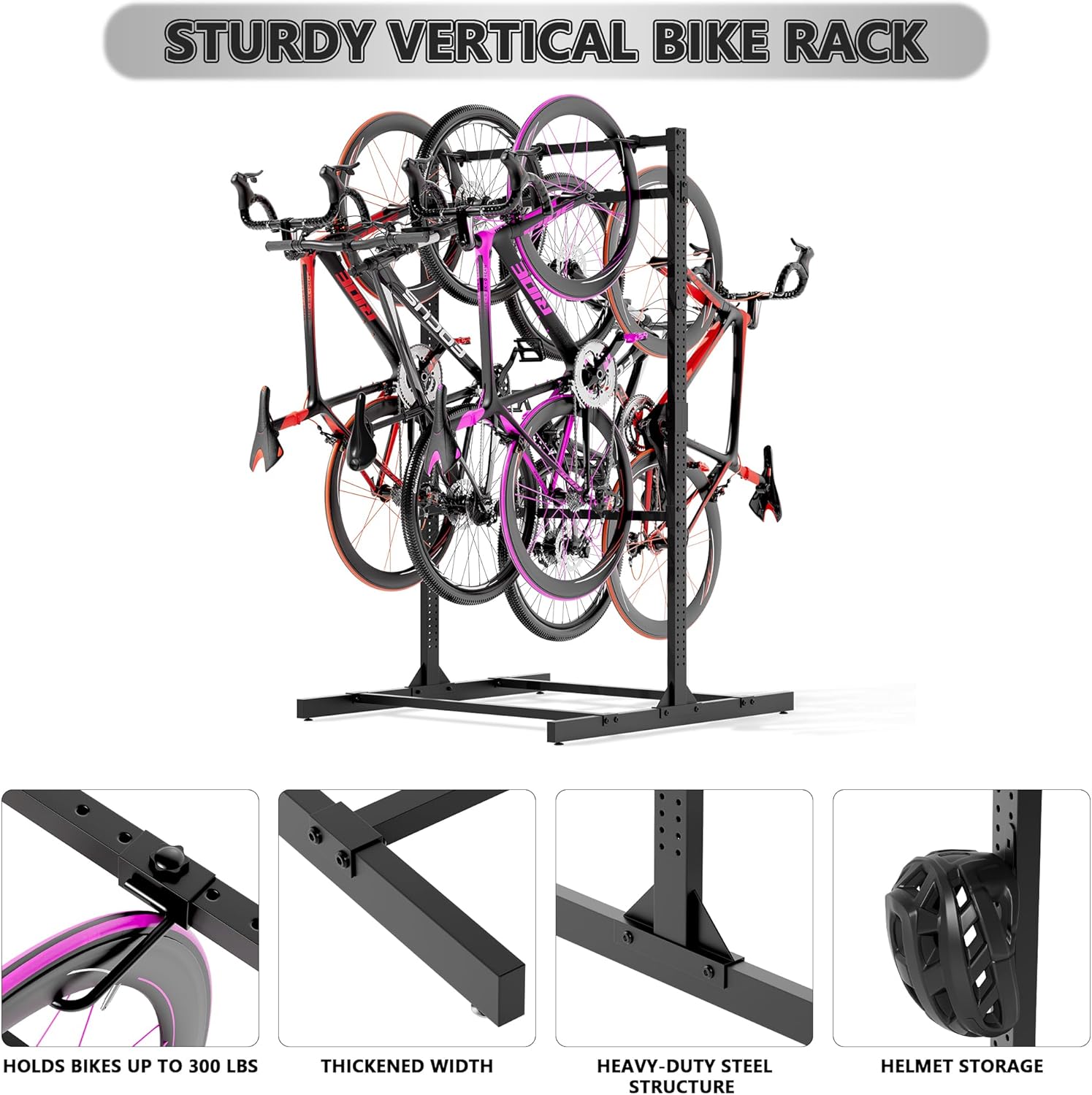 - ☪【Heavy Duty Bike Rack】: The vertical bike stand is made of industrial-grade steel and aluminum, which is sturdy and durable, and the heavy-duty steel frame has a strong load-bearing capacity. Each hook of this rack can bear up to 60 pounds. The matte black powder coating is super durable, scratch-resistant and rust-resistant.