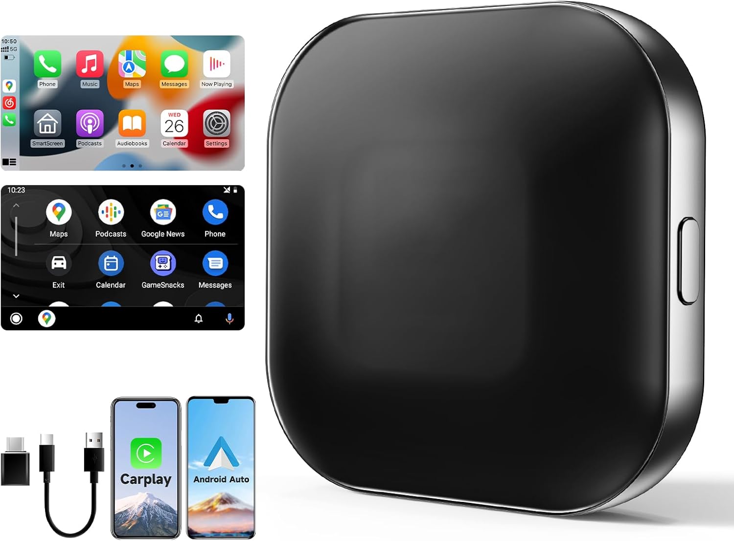 - 【Compact,Powerful and Sleek Design】The wireless carplay and android auto dongle has a slim, space-saving design that integrates seamlessly into your vehicle's interior look.Its portability also makes it easy to remove and take with you on the go when switching between vehicles. The compact and lightweight size allows it to fit unobtrusively wherever you need it without cluttering your car.