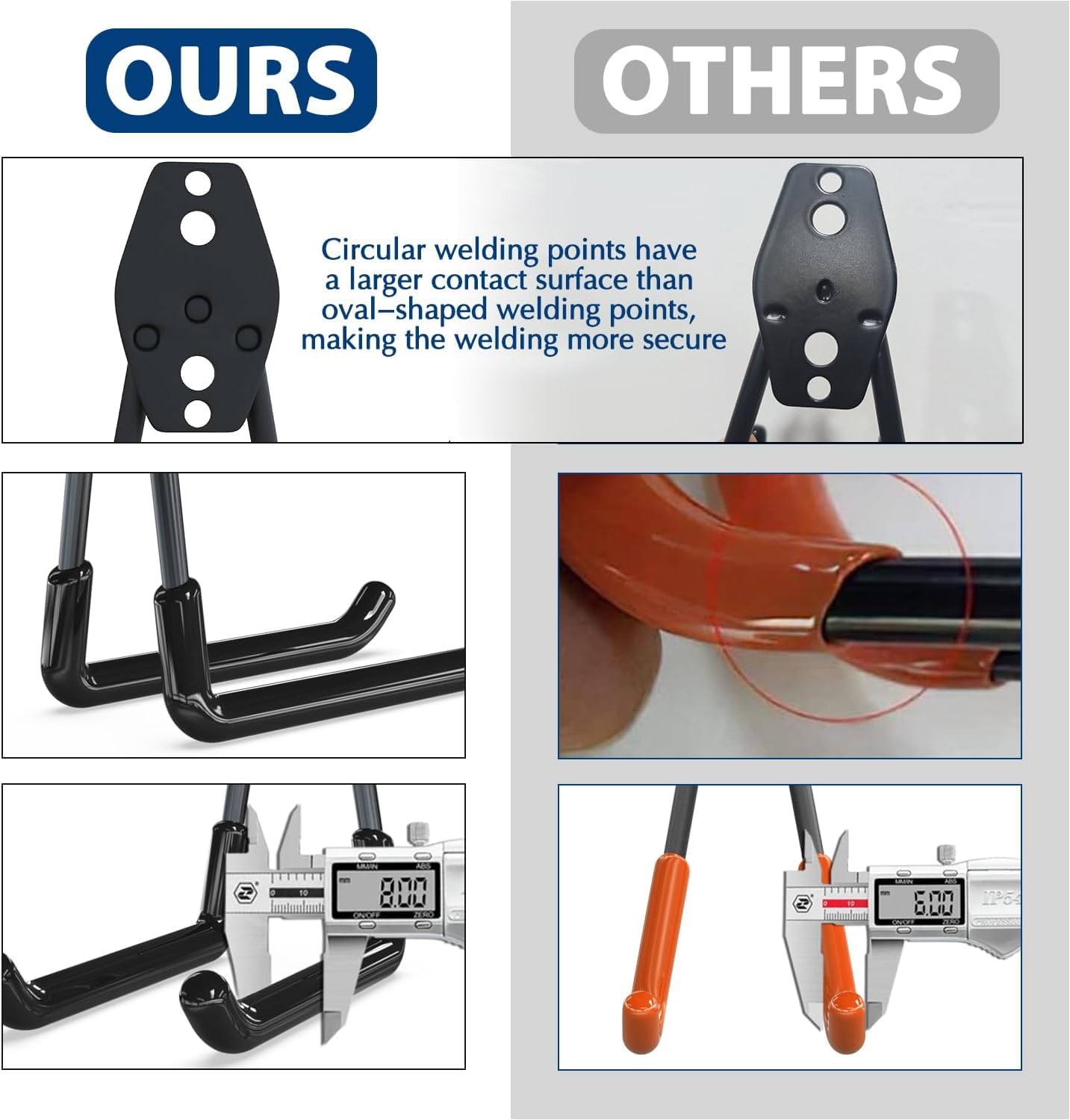 - Upgrade Design for Garage Storage Hooks: Different from other similar garage hooks heavy duty with oval-shaped welding points, our designed circular welding points. These provide a larger contact surface between the hook and the backboard, offering higher security. With this design, there’s no need to worry about the rear steel panel splitting or falling off, a perfect choice of wall hooks for hanging heavy duty