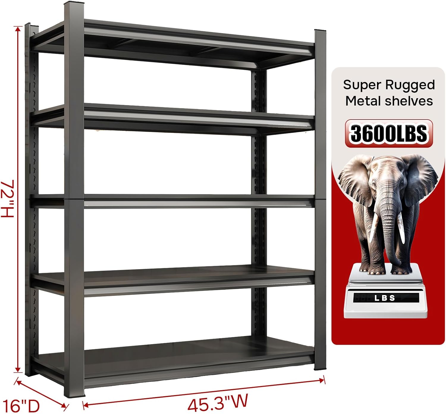 45.3" W Metal Garage Shelving Unit 3500LBS Metal Storage Shelves 5 Tier Adjustable Shelving Unit Garage Shelves for Kitchen Warehouse Pantry Basement,Rust-Resistant, 72" H x 45.3" W x 16" D,Black