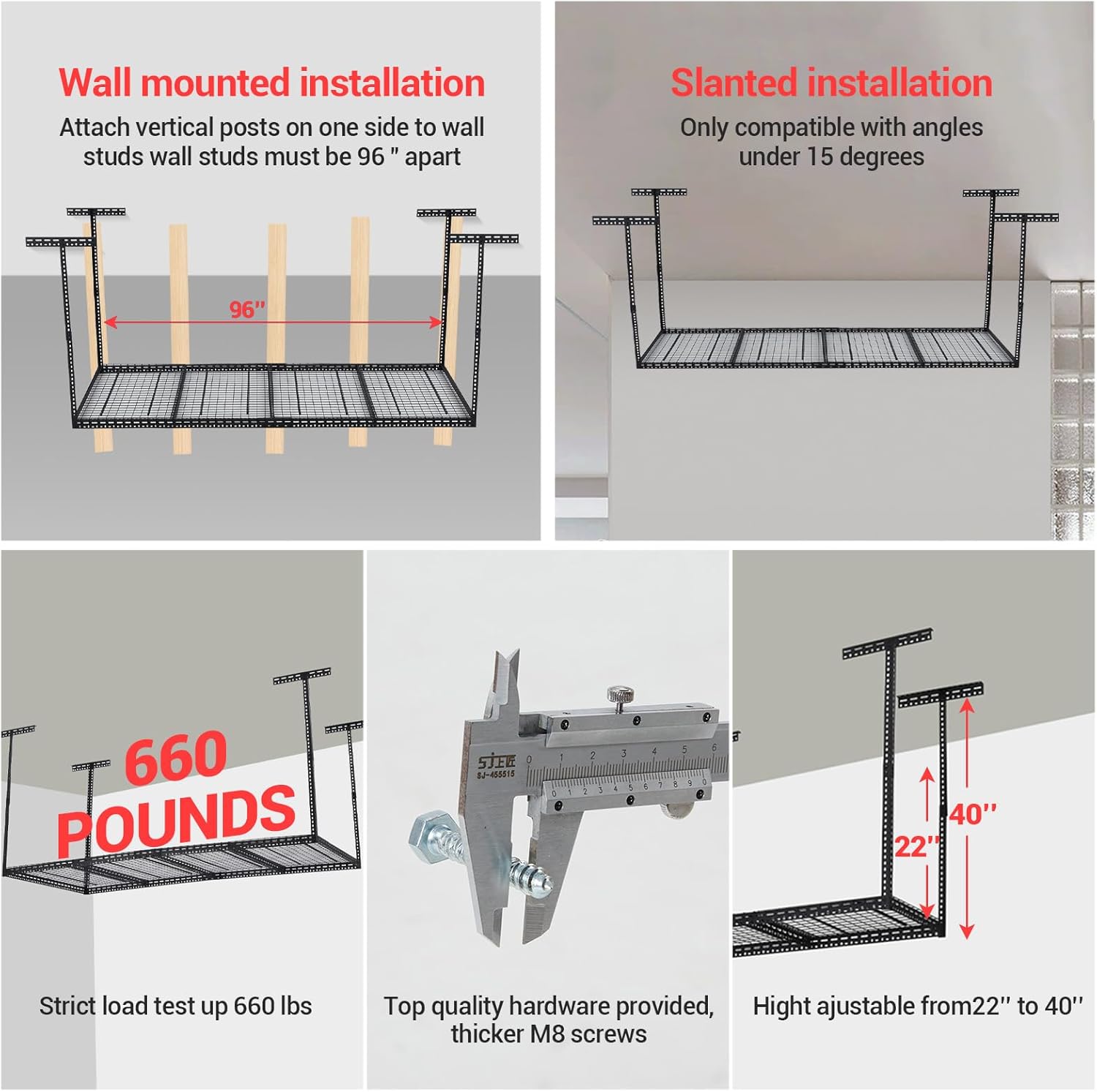 - Rust-Proof & Secure Installation: The scratch-resistant black finish resists rust and wipes clean effortlessly. Must be mounted to wood studs, joists, or concrete (drywall not supported). Designed for ≤15° sloped ceilings—follow instructions for safe, wobble-free garage ceiling storage installation.