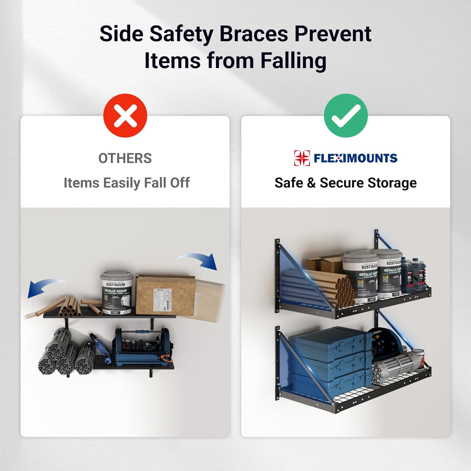 - Stable Triangular Brace Design - Reinforced with a diagonal triangular brace, the structure stays rock-solid even under heavy loads. The angled support prevents wobbling and adds extra security by keeping items from sliding off—ideal for safe garage organization and storage
