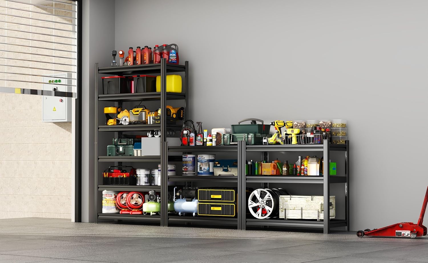- 【Strong Load-bearing Capacity】Shelves are made of high-quality steel, our garage shelves have extraordinary load-bearing capacity, even heavy toolboxes, tires or sports equipment can be easily carried to ensure the safety of your belongings