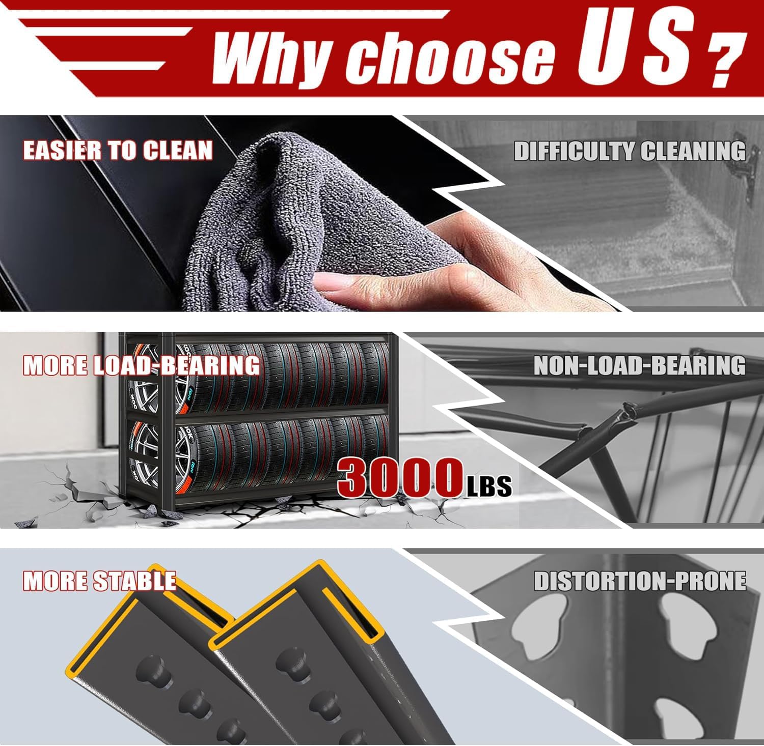 - Enhanced Stability with Double-Layer Uprights,Compared to basic single-layer metal shelving, our upgraded double-layer uprights for this garage shelving boost load-bearing capacity and help reduce warping. Ideal for heavy-duty use, this metal shelving design supports long-term durability with minimized wobbling or sagging, outperforming flimsier storage shelves in daily use